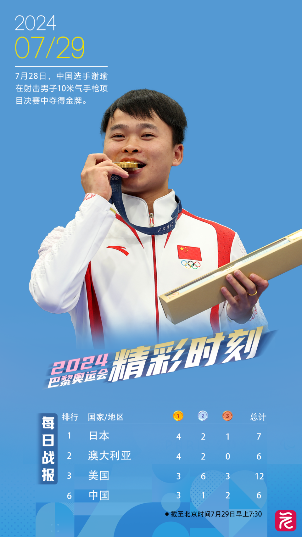 巴黎奥运会第二个比赛日落下帷幕 共决出13枚金牌 其中 射击男子10米气手枪金牌被中国队收入囊中 截至北京时间29日早上7时 中国代表团共斩获 3枚金牌、1枚银牌、2枚铜牌