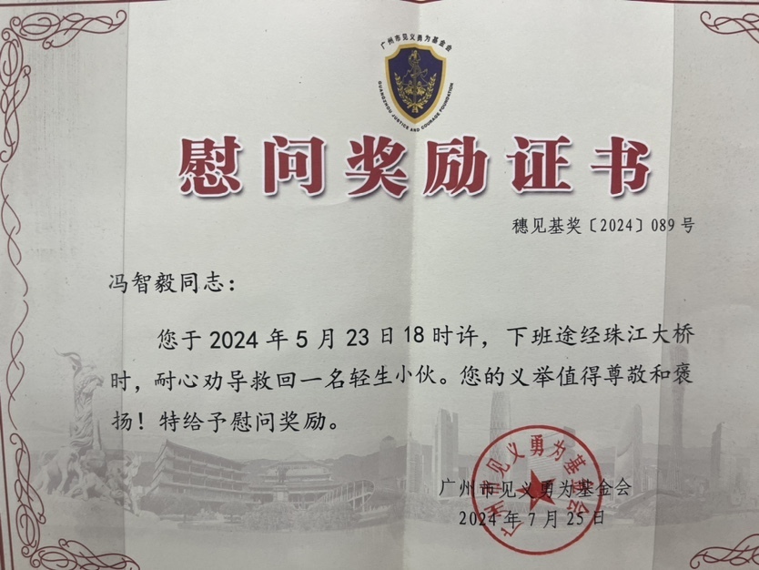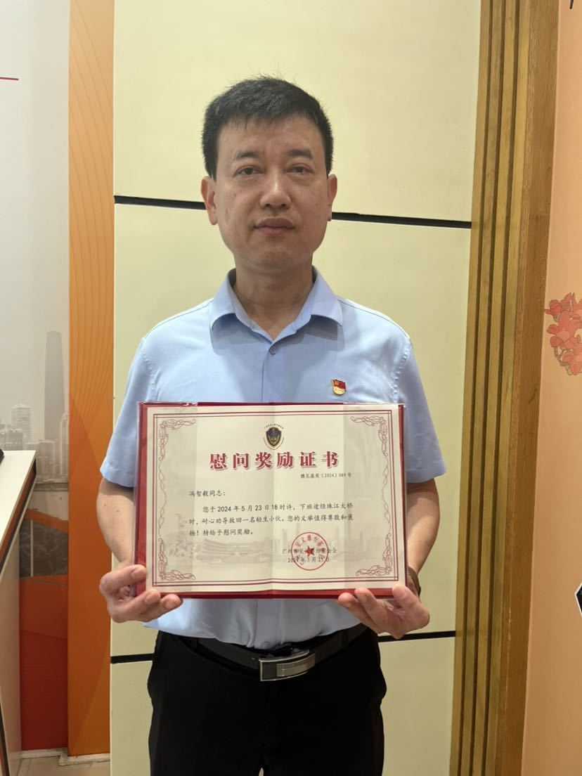 一名年轻小伙因情感纠纷,欲跳珠江轻生。在这紧要关头,途经此处的广州医科大学附属第三医院体检中心主任冯智毅毅然挺身而出,运用所学的专业心理学知识和沟通技巧,耐心劝导对方半个多钟,最终成功解开对方心结,联手在场民警合力将小伙救下。近日,广州市见义勇为基金会集中慰问奖励近期涌现的见义勇为平民英雄,冯智毅登上领奖台获得表彰。据悉,这并非冯智毅在院外首次救人,多年前,他还成功劝说并救下一名意图跳楼轻生的女孩。