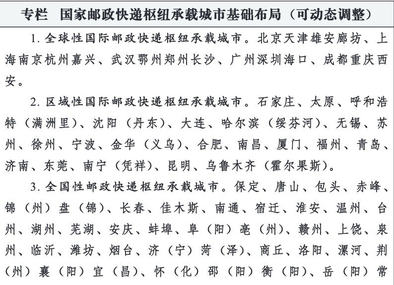 《指导意见》提出,要在全国布局80个左右国家邮政快递枢纽,包括15个左右全球性国际邮政快递枢纽、20个左右区域性国际邮政快递枢纽、45个左右全国性邮政快递枢纽,每个枢纽可因地制宜布局建设1—3个国家邮政快递枢纽功能区(统称“国家邮政快递枢纽”),枢纽功能区由相应城市承载。同时,还要依据城市战略定位、辐射集聚作用、邮件快件处理能力等基础构成,统筹考虑国家重大战略实施、区域经济发展、产业结构优化升级等需要,结合邮政快递企业现有枢纽格局,在全国选取100个左右国家邮政快递枢纽承载城市。