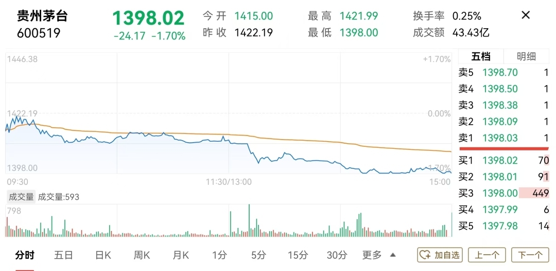 或受到机构评级等因素影响,从当日市场来看,白酒板块走弱,贵州茅台跌穿1400元关口,跌幅达1.70%。与此同时,山西汾酒、迎驾贡酒、古井贡酒、泸州老窖等跌幅超2%,今世缘跌幅达5.46%。