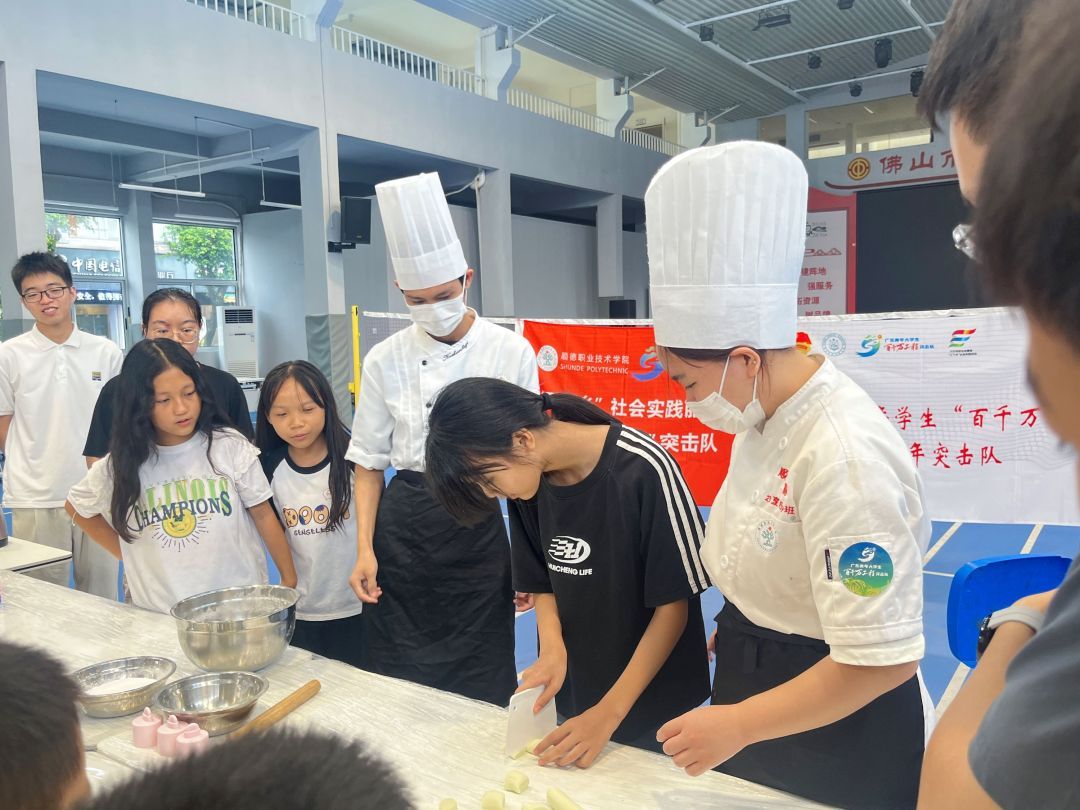 顺德职业技术学院“粤厨有way——探寻特色乡村味蕾”突击队利用烹饪技术对南山镇特色产业进行研发,通过传授烹饪技术与开设培训班的模式,带动南山镇新业态发展。突击队以菜品研发、菜单更新、烹饪技术交流的“组合拳”为相关餐饮企业更新了菜品12项、创新研发了菜单5张、实操烹制了10余个菜品来进行品鉴学习。另外,设立便民为民“服务站”,开设“粤菜师傅”技能培训班教授市民自制冰皮月饼和柠檬茶,服务群众近1000人次。