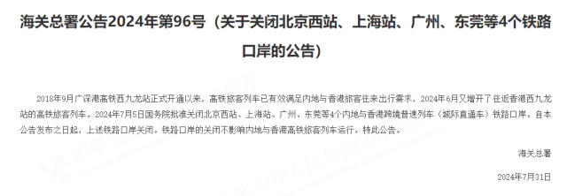 据海关总署消息,2018年9月广深港高铁西九龙站正式开通以来,高铁旅客列车已有效满足内地与香港旅客往来出行需求,2024年6月又增开了往返香港西九龙站的高铁旅客列车。2024年7月5日国务院批准关闭北京西站、上海站、广州、东莞等4个内地与香港跨境普速列车(城际直通车)铁路口岸。自本公告发布之日起,上述铁路口岸关闭。铁路口岸的关闭不影响内地与香港高铁旅客列车运行。特此公告。