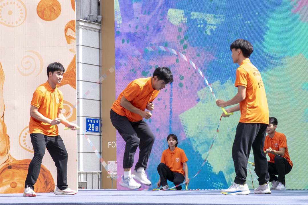 来自广州市花都区花东学校跳绳队的同学们表演了一场别出心裁的原创话剧《七彩绳话》。
