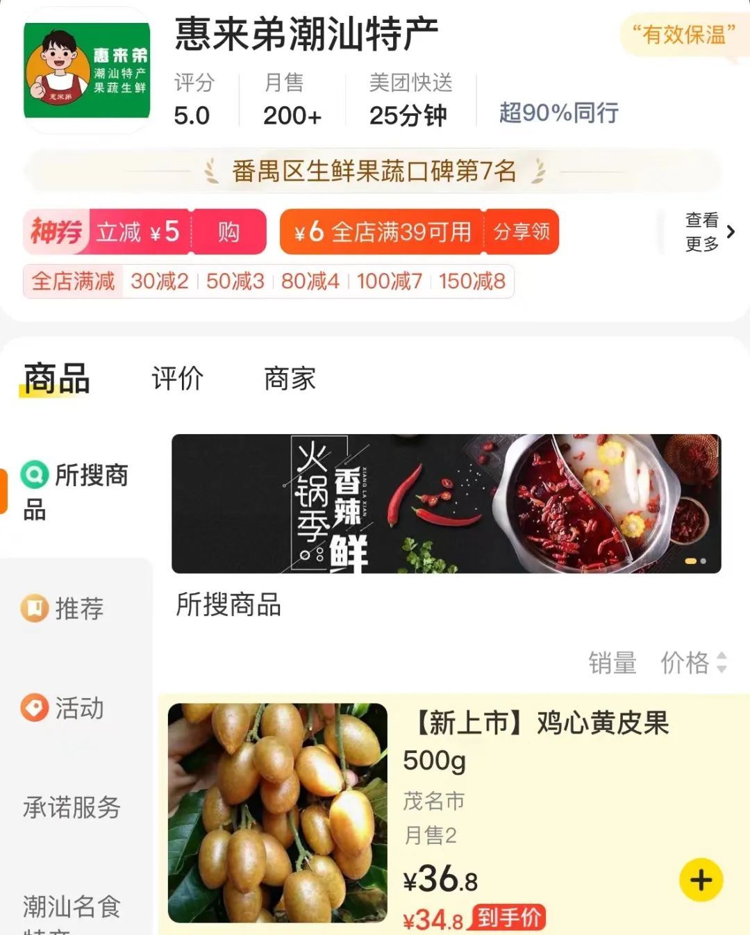 也有一些水果商户黄皮产品供应充足,番禺一家水果店出售的鸡心黄皮果是茂名高州市的,门店价格为25元/斤,线上价格为34~36元/斤,记者以10斤起买来送礼为由询问店家,店家称可以在门店价格上每斤再优惠3元。