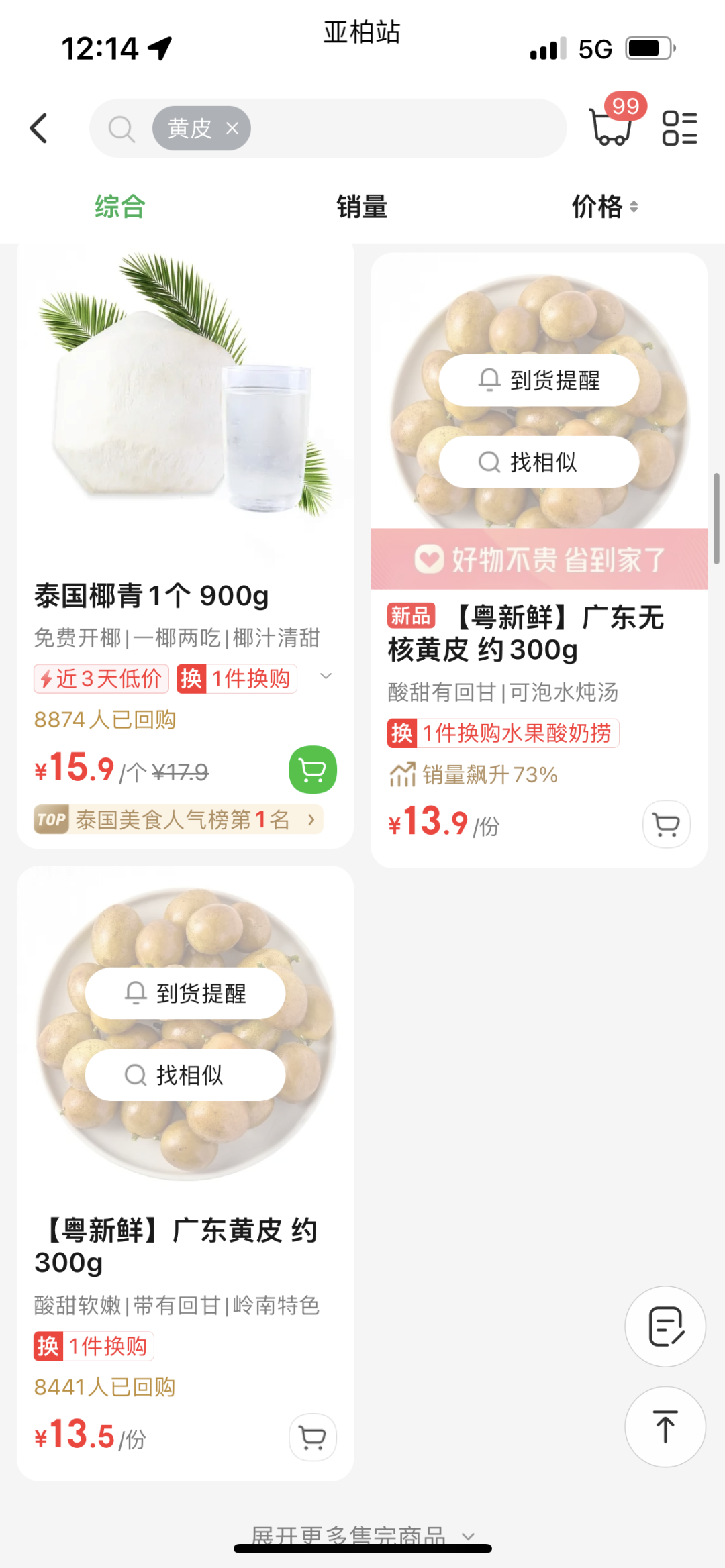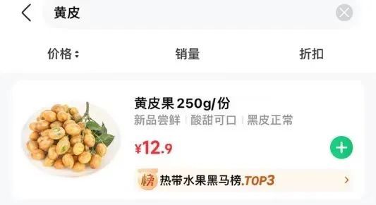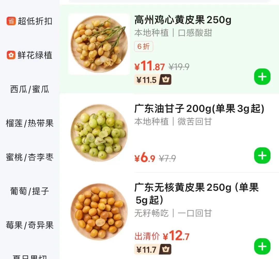 线上平台方面,黄皮的价格竞争十分激烈,从近两日记者调查的数据来看,线上平台的黄皮价格普遍高于线下市场,记者在盒马、朴朴超市、美团小象超市等线上平台搜索了黄皮,其中,盒马销售的300g无核黄皮价格为19.9元,朴朴超市黄皮果价格为12.9元/250g,小象超市11.87~12.7元/250g,而叮咚目前显示缺货状态,到货提醒。
