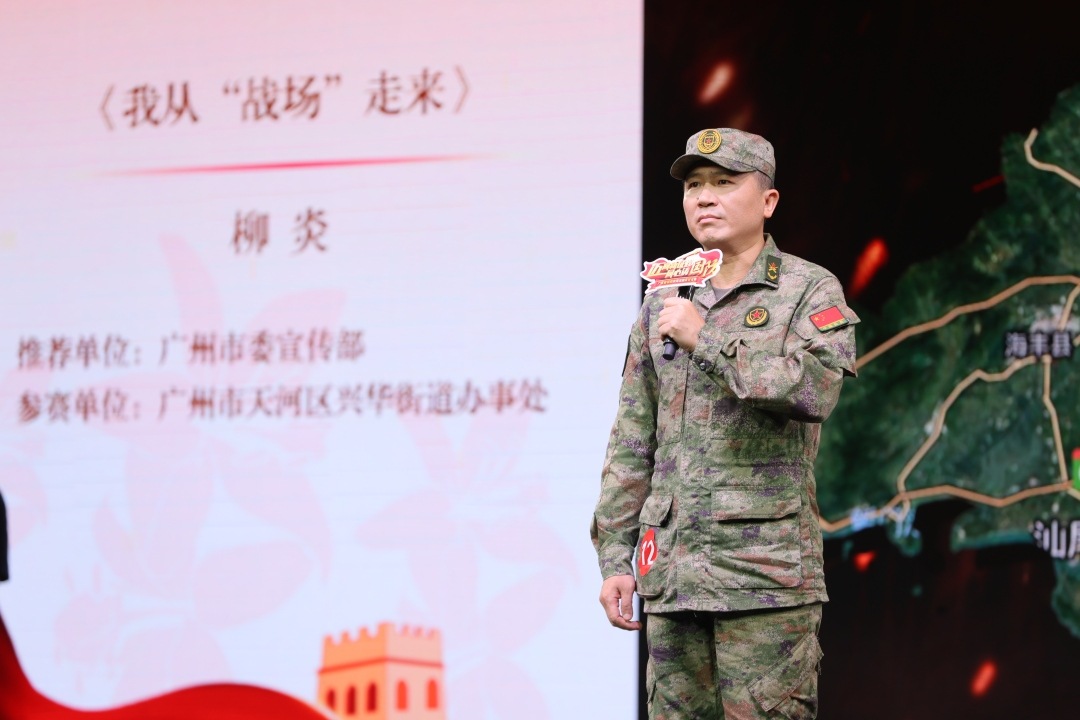 来自天河区兴华街道办事处的柳炎以《我从“战场”走来》为题,讲述了自己人生的三个“战场”,他曾在特战分队英勇无畏,面对生死考验,以超凡的冷静和果敢,确保了战友和自己的生命安全,展现了“不叫苦不畏难不惧险不怕死”的特战精神。这份精神,成为他人生旅途中最坚实的盔甲。