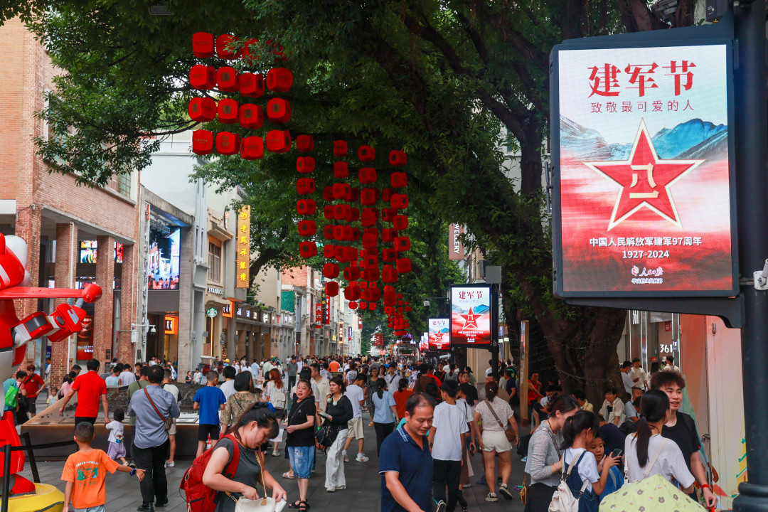 北京路新大新百货大楼8K超高清裸眼3D大屏循环播放征兵宣传片和“八一”宣传海报,步行街设置了多面征兵元素灯杆和刀旗,附近两个大型LED显示屏同步播放征兵宣传片与红色军旅歌曲MV,大力营造了拥军爱军的浓厚氛围。“视觉冲击力很强,看完热血沸腾,忍不住拿手机记录下来。”游客李先生说道。