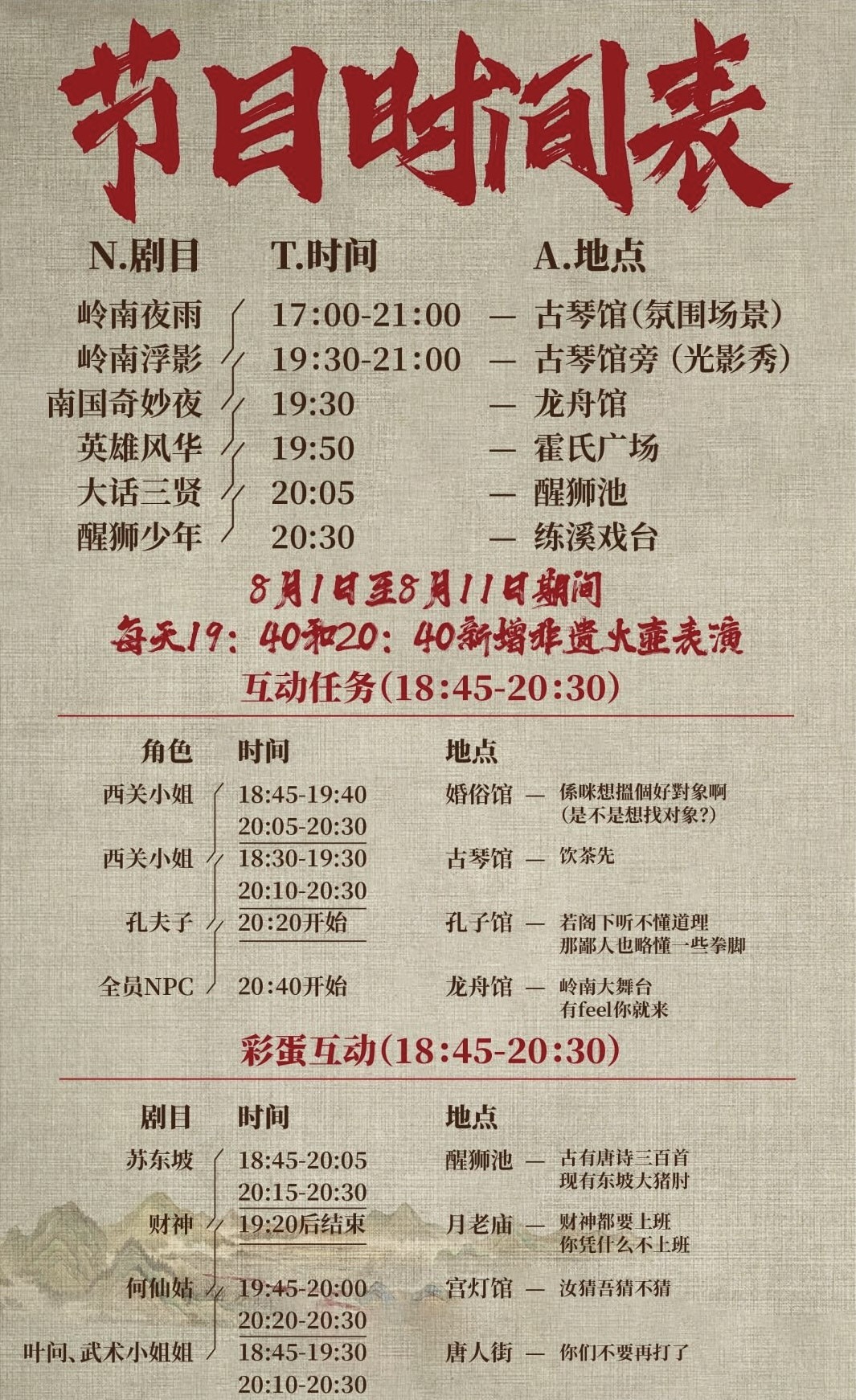 期间,游客可参与各种互动任务、互动小彩蛋,如听西关小姐讲述岭南故事、与孔子“文斗”、跟武侠小姐姐学习武术等,惊喜不断。尤其值得一提的是,8月1日至8月11日期间,特别安排每晚两场非遗火壶表演,灵动跳跃的火花璀璨夺目,非遗传承人将为您展现传承千年的精湛绝技,寄托了人们对美好生活的祈愿,让您在惊叹中感受传统文化的博大精深。丰富的互动表演增加了游客的参与度和消费意愿,为景区的夜间经济注入活力。