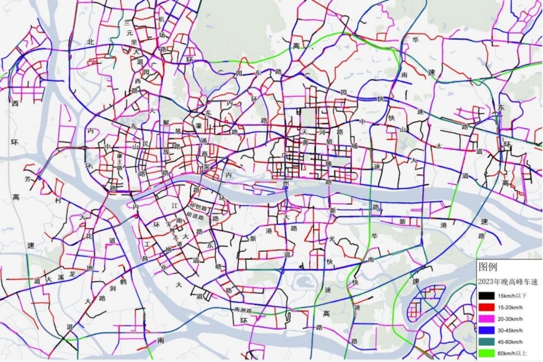 核心区道路运作接近饱和。《报告》也透露,2023年广州核心区晚高峰干道平均车速22.8公里/小时,基本降至2019年的22.5公里/小时水平。高峰小时承载的车辆周转量为288万车公里,路网饱和度为0.86,基本接近极限容量,若饱和度达到0.9,拥堵水平将急剧增长且道路运作极不稳定。