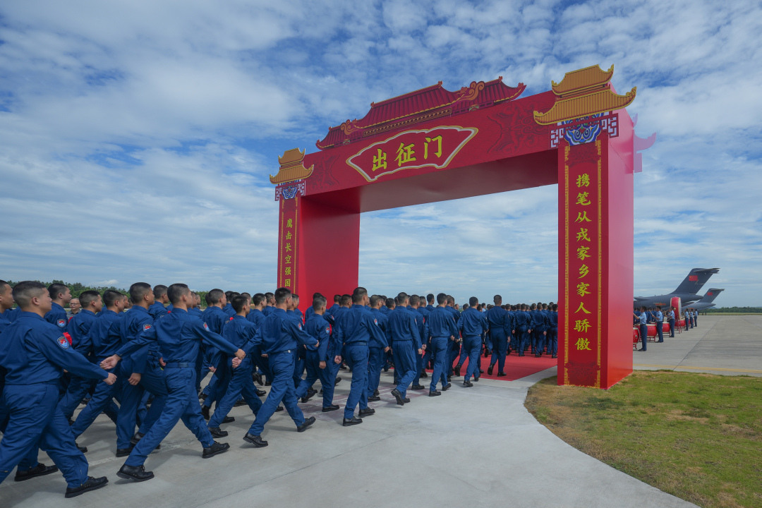 碧空万里下的机场跑道上,两架运-20飞机已经“待命起飞”,现场旗帜飘扬、锣鼓喧天。新学员们整齐列队踏上红毯,迈过庄严的出征门,至集中登机处。众多家长共同参与见证这一重要时刻。看着孩子们的登机背影,家长们虽红了眼眶,但更多的是骄傲与期待。