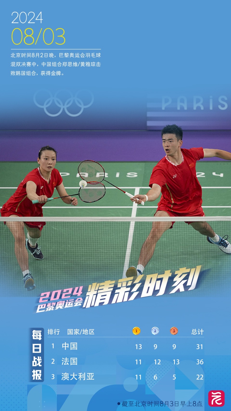 奥运时刻 | “雅思”组合巴黎圆梦;国乒国羽将上演巅峰对决