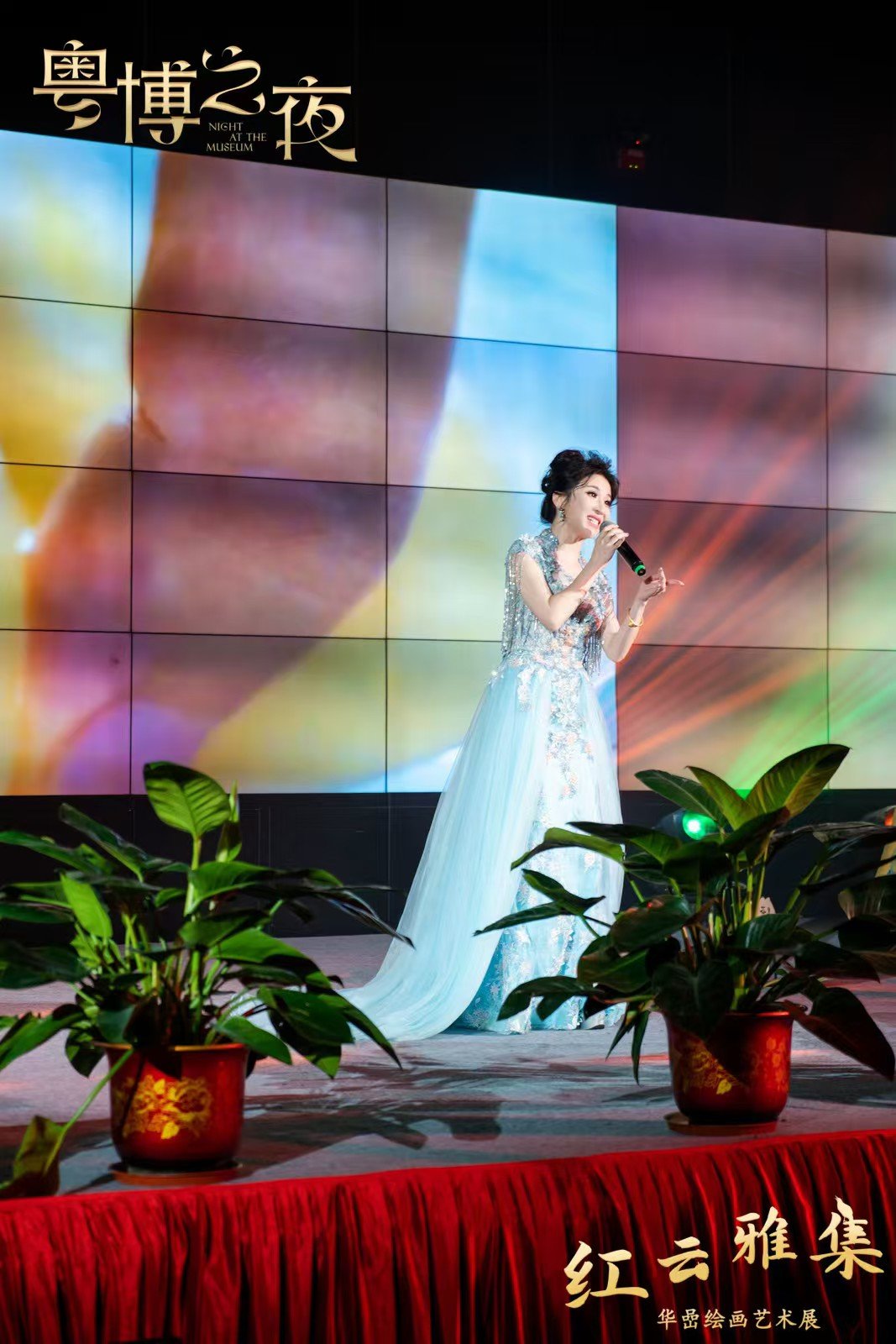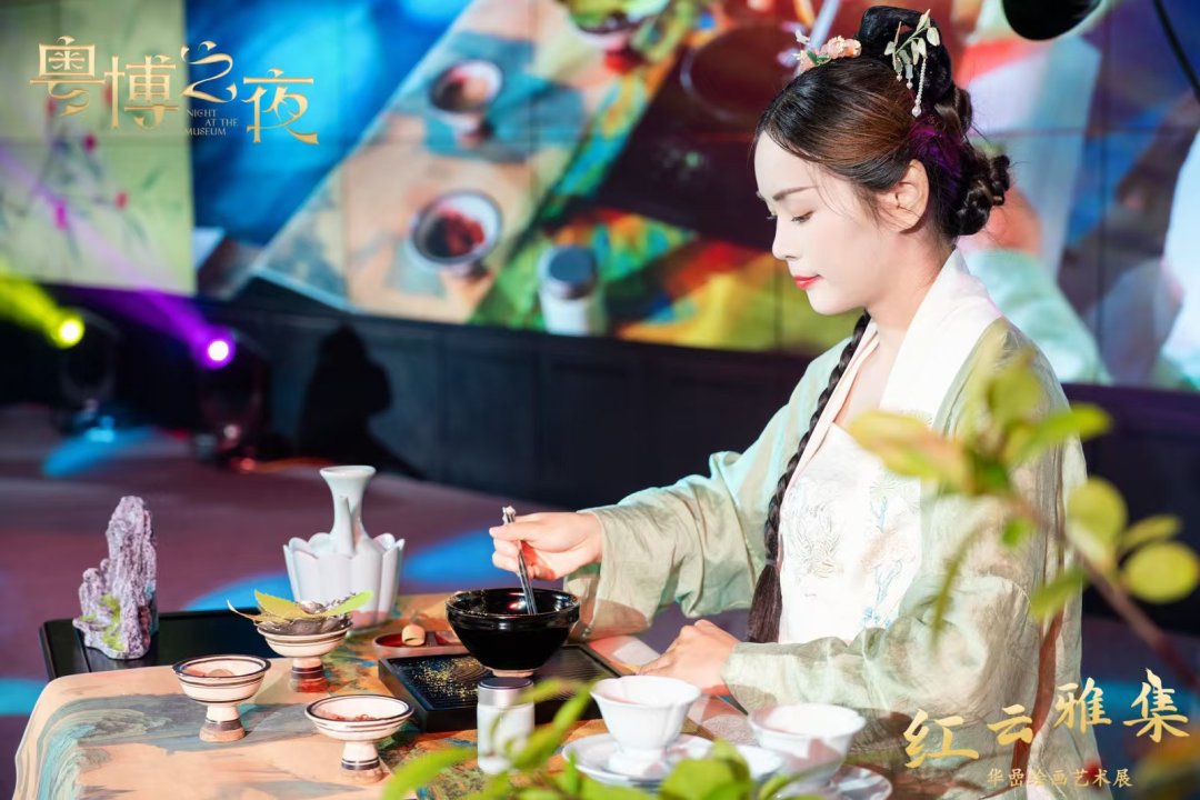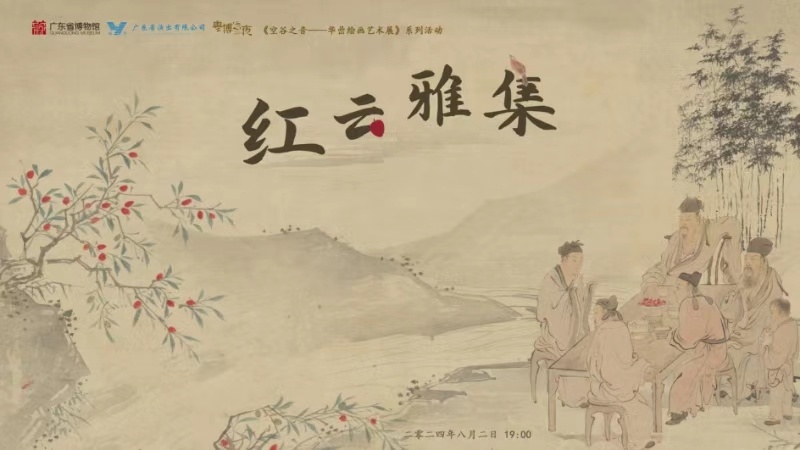 因此,本场“红云雅集”以阮元之子阮福赴红云宴、父子对谈、携眷游荔湾的故事情节为主线,在演员对白之间为观众解读华嵒的《鹦鹉荔枝图轴》《啖荔图卷》《金屋春深图》《松鹤图轴》这四幅精品画作。既有与荔枝主题相关的画作,如展现鹦鹉被荔枝吸引的《鹦鹉荔枝图轴》,为“满足”钱塘周念修借画品荔心愿而作的《啖荔图卷》,《金屋春深图》则塑造了杨贵妃因牙疼无力向君王索要荔枝这一柔柔弱弱、楚楚可怜的形象,也有取意吉祥的祝寿画作《松鹤图轴》,在剧情中带领观众走进华嵒笔下的艺术世界,了解古人的闲情逸趣,欣赏华嵒细腻文雅的笔墨,领略一花一鸟、一草一木的生趣盎然。剧情中还穿插竹笛演奏《柳摇金》、古琴演奏《鸥鹭忘机》、古筝演奏《出水莲》,让大家置身于鸟语花香、水波荡漾的意境里,沉浸在古典音乐的流转中。配上茶戏《漏影春》,让现场观众重温古代文人的风雅与闲适,体验中国传统茶文化的独特魅力;粤曲演唱《荔枝颂》带领观众一起感受岭南荔枝的鲜甜与悠久文化,体验文人雅集上的风雅与情趣。这些故事节目演绎借助多媒体动态视频,带领观众在光影之中跨越时空,跟随阮元一家三口重回清代广州荔枝湾,一同听曲赏画,啖荔品茶,丰富观众对华嵒绘画艺术的理解,感受中国传统文化的深厚底蕴。