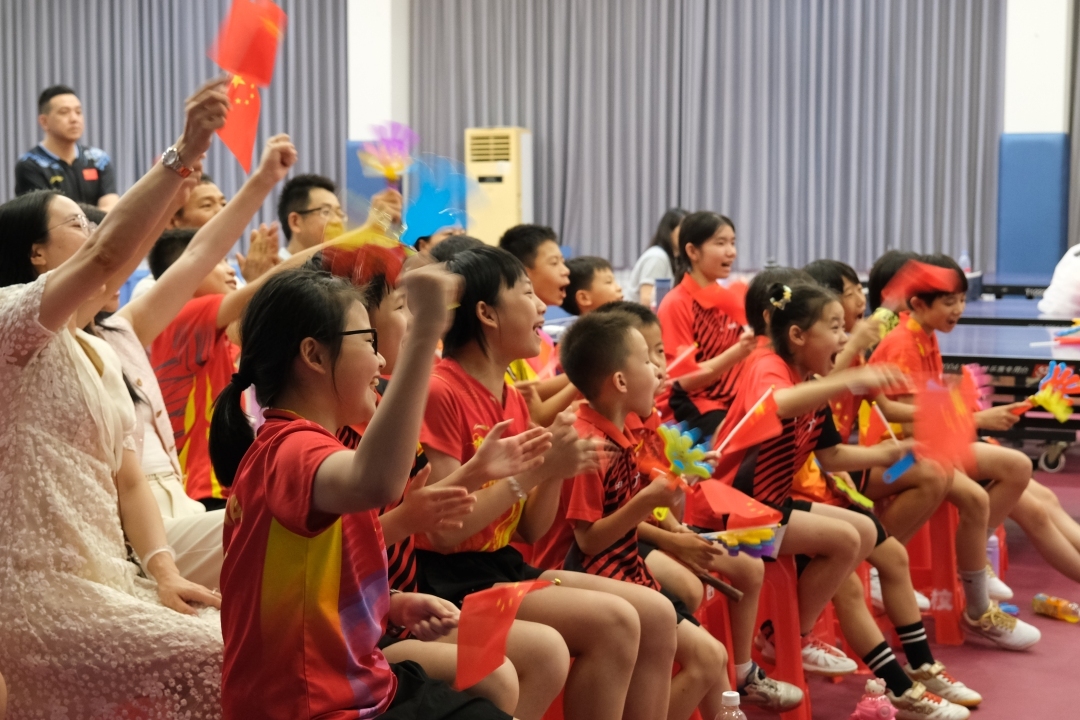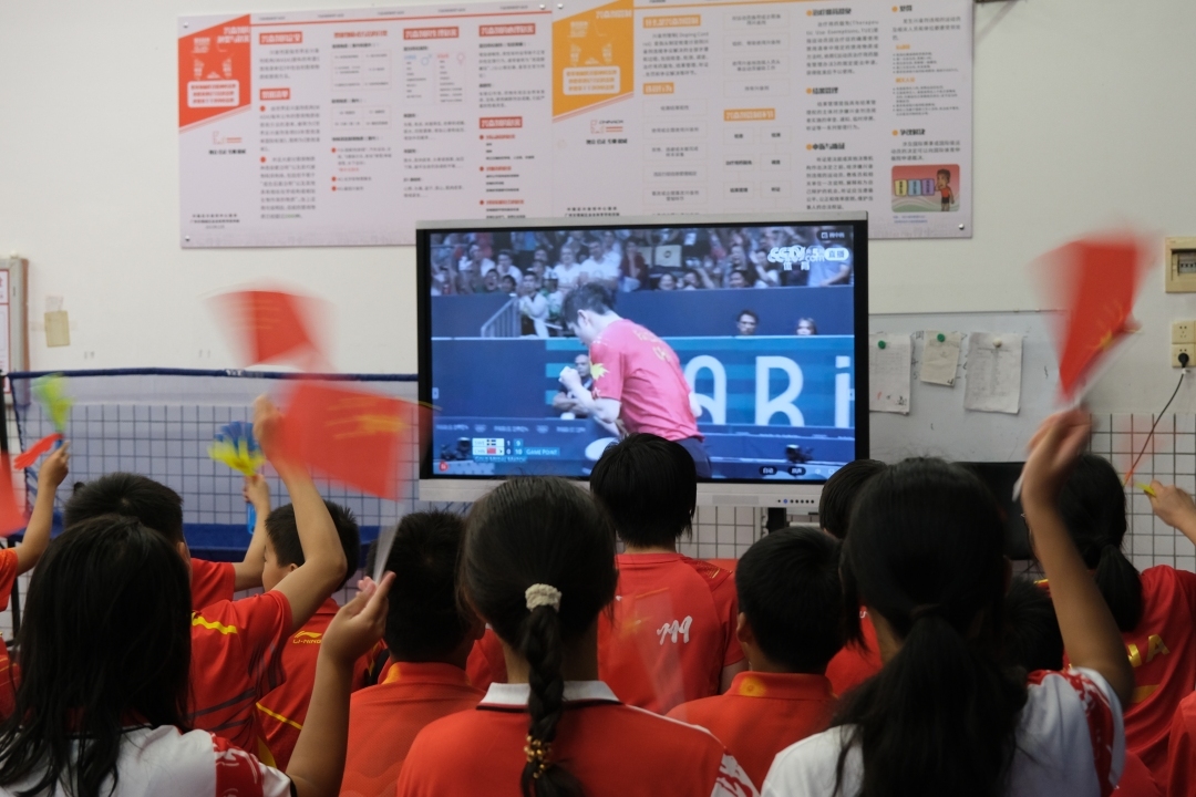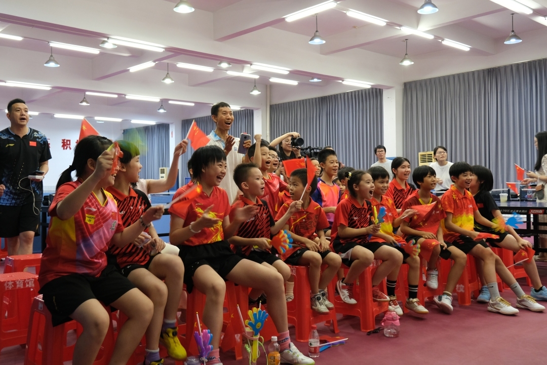 广州市增城区业余体校乒乓球训练场馆内,林锦文带领小队员为樊振东呐喊助威。