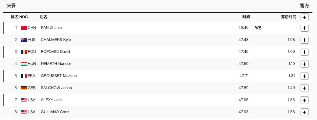 男子100米自由泳决赛比赛成绩。图片来源:巴黎奥运会官网