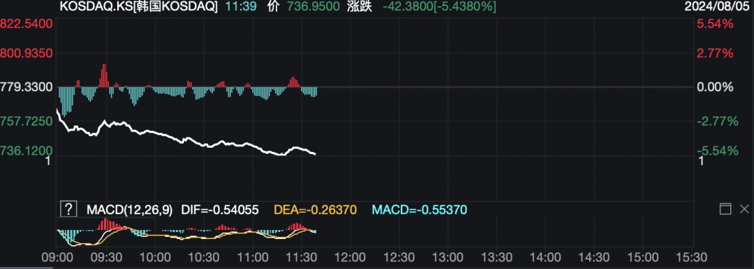 上午韩国股市也出现暴跌,韩国综合指数盘中跌幅超过4%,韩国KOSDAQ指数跌超5%,并均留下巨大向下跳空缺口。三星电子跌幅扩大至9%,为2008年以来最大跌幅。韩国交易所暂停接受程序化交易买单的“Sidecar”机制被触发,将程序化交易暂停5分钟。“Sidecar”机制是韩国交易所为应对股市剧烈波动而设立的一种临时停牌制度,特别是针对程序化交易。当股市指数或期货价格出现大幅偏离前一日收盘价或公平价格,并且这种偏离持续一定时间时,该机制会被触发,以暂停程序化交易买单,从而给市场一定的冷静期,防止过度波动。