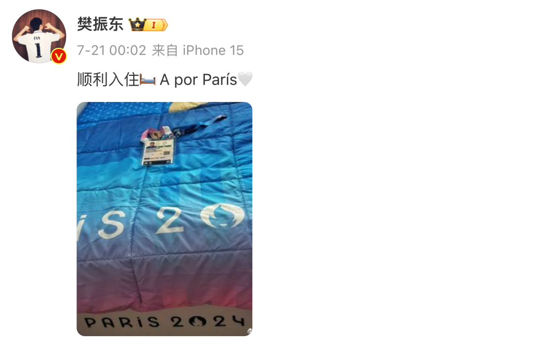 7月21日凌晨,樊振东在自己的微博上晒出入驻奥运村的照片,他的第三次奥林匹克之旅正式开始了。