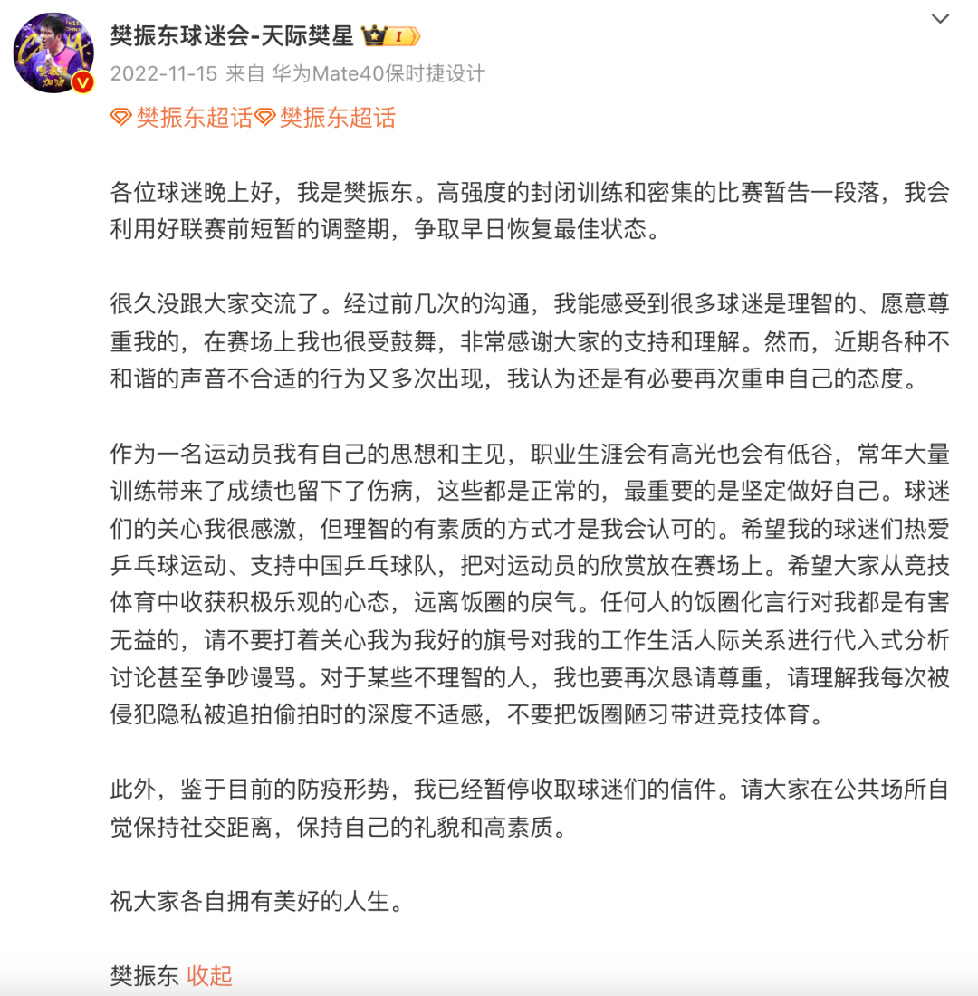 樊振东通过球迷会微博,发表长文明确了态度。他说,作为一名运动员我有自己的思想和主见,职业生涯会有高光也会有低谷,常年大量训练带来了成绩也留下了伤病,这些都是正常的,最重要的是坚定做好自己。