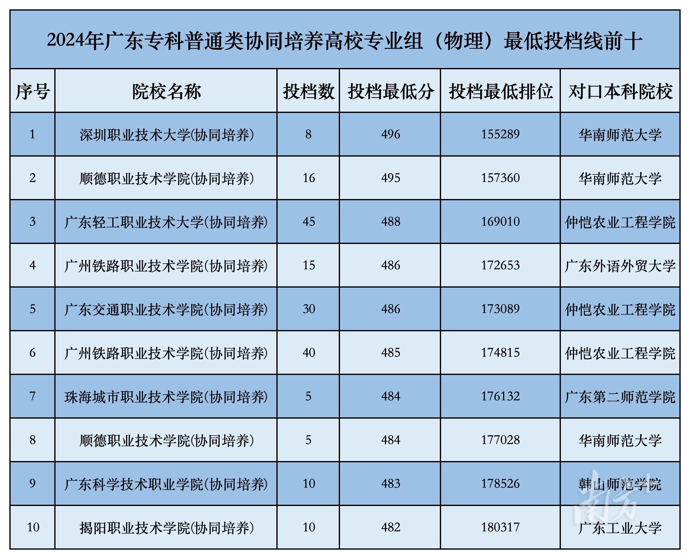 物理类中,广州铁路职业技术学院应用英语专业对口广东外语外贸大学,投档最低分486分;广东交通职业技术学院计算机网络技术专业对口仲恺农业工程学院,投档最低分486分;广东科学技术职业学院商务英语专业对口韩山师范学院,投档最低分483分。
