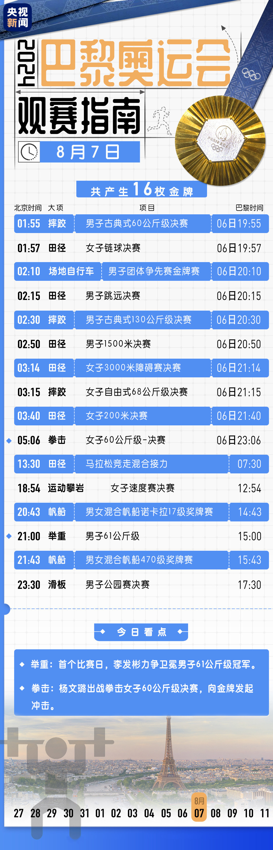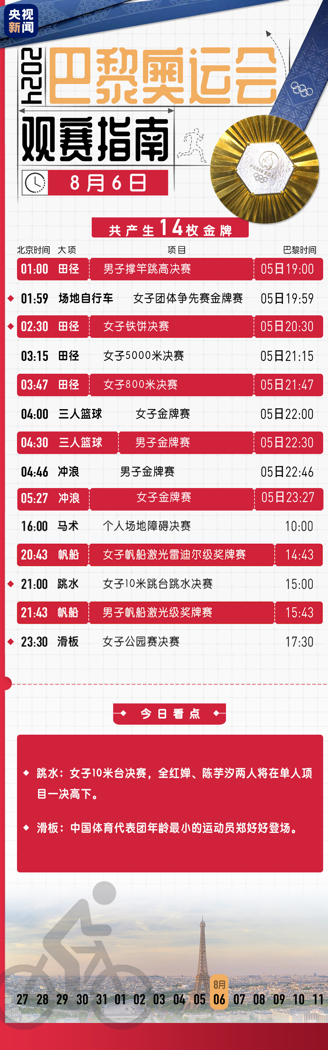 第十比赛日,我们见证了射击老将李越宏圆梦巴黎、邹敬园成功卫冕………第十一个比赛日,全红婵陈芋汐迎来巅峰对决,还有哪些精彩看点,先睹为快!