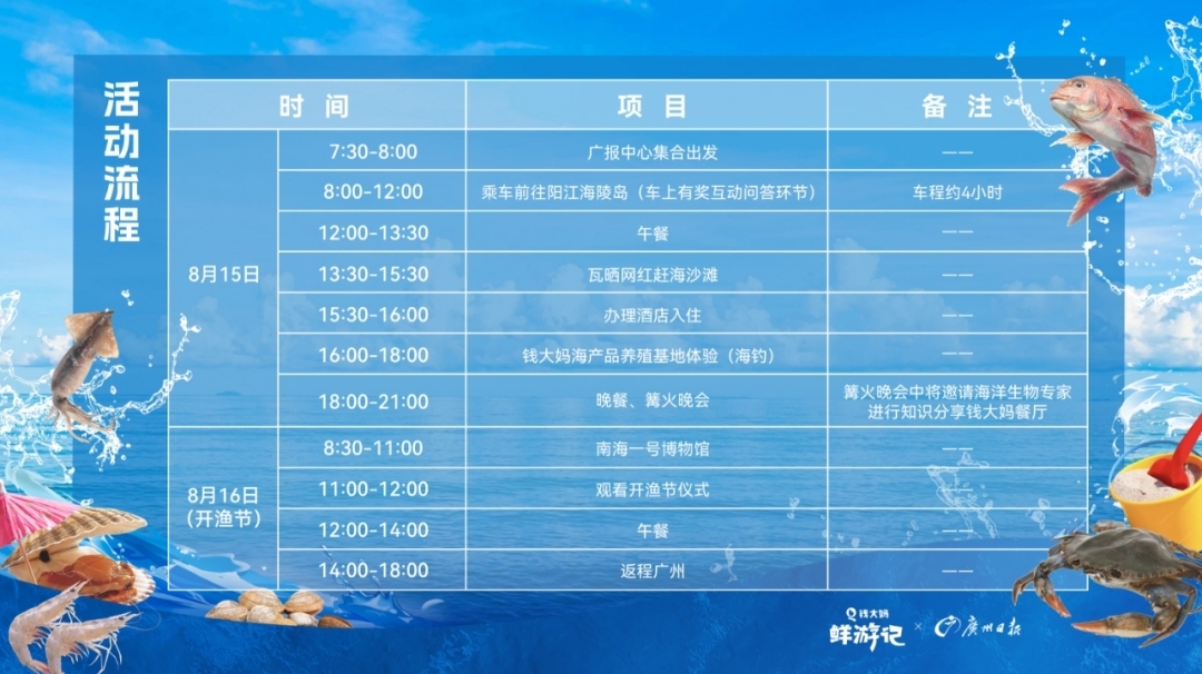 8月15日~16日,钱大妈携手广州日报组织的读者基地溯源活动将再次启航。在阳江海陵岛,我们不仅将亲身体验阳江开渔节的盛大与喜悦,更将深入钱大妈供应商的鱼排,从源头见证食材的纯净与新鲜,开启一场关于海洋、美食与探索的别开生面的海鲜探秘之旅。