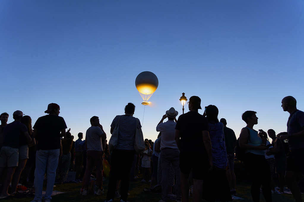 当地时间2024年8月5日,法国巴黎,巴黎奥运会,奥运主火炬辉映蔚蓝夜空,游客观赏打卡
