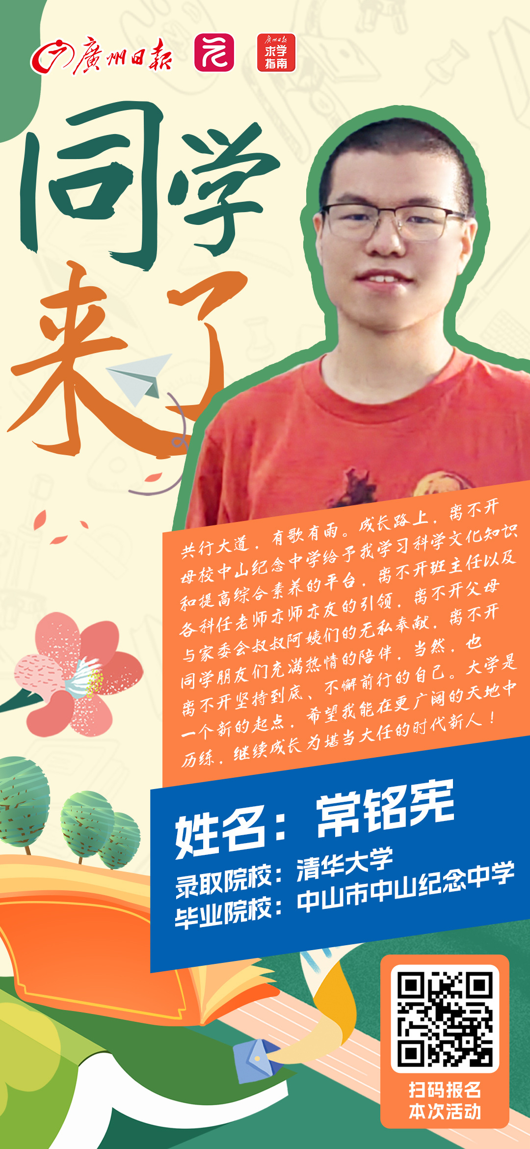 而常铭宪同学则对母校的栽培心存感恩。“成长路上,离不开母校中山纪念中学给予我学习科学文化知识和提高综合素养的平台,离不开班主任以及各科任老师亦师亦友的引领,离不开父母与家委会叔叔阿姨们的无私奉献,离不开同学朋友们充满热情的陪伴,当然,也离不开坚持到底、不懈前行的自己。”常铭宪说,“大学是一个新的起点,希望我能在更广阔的天地中历练,继续成长为堪当大任的时代新人!”