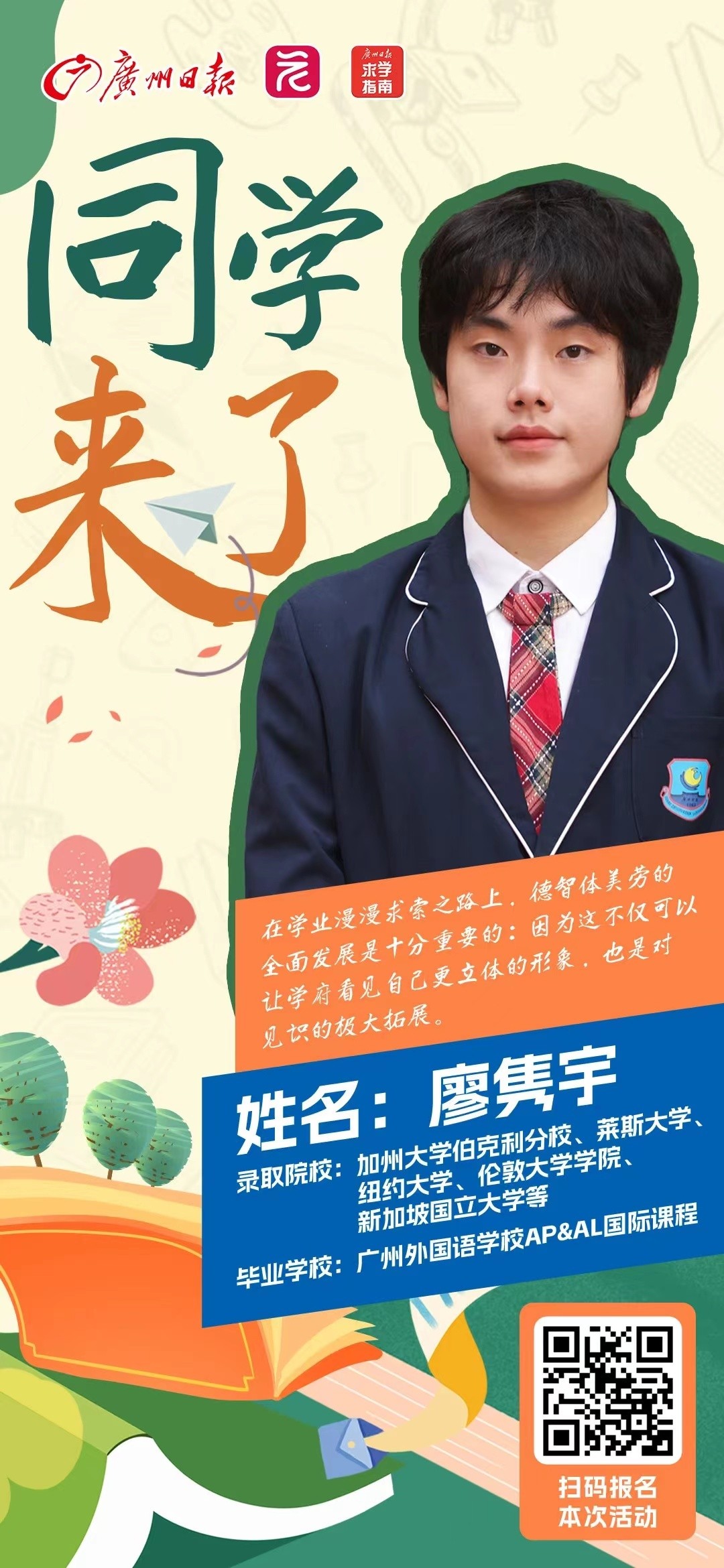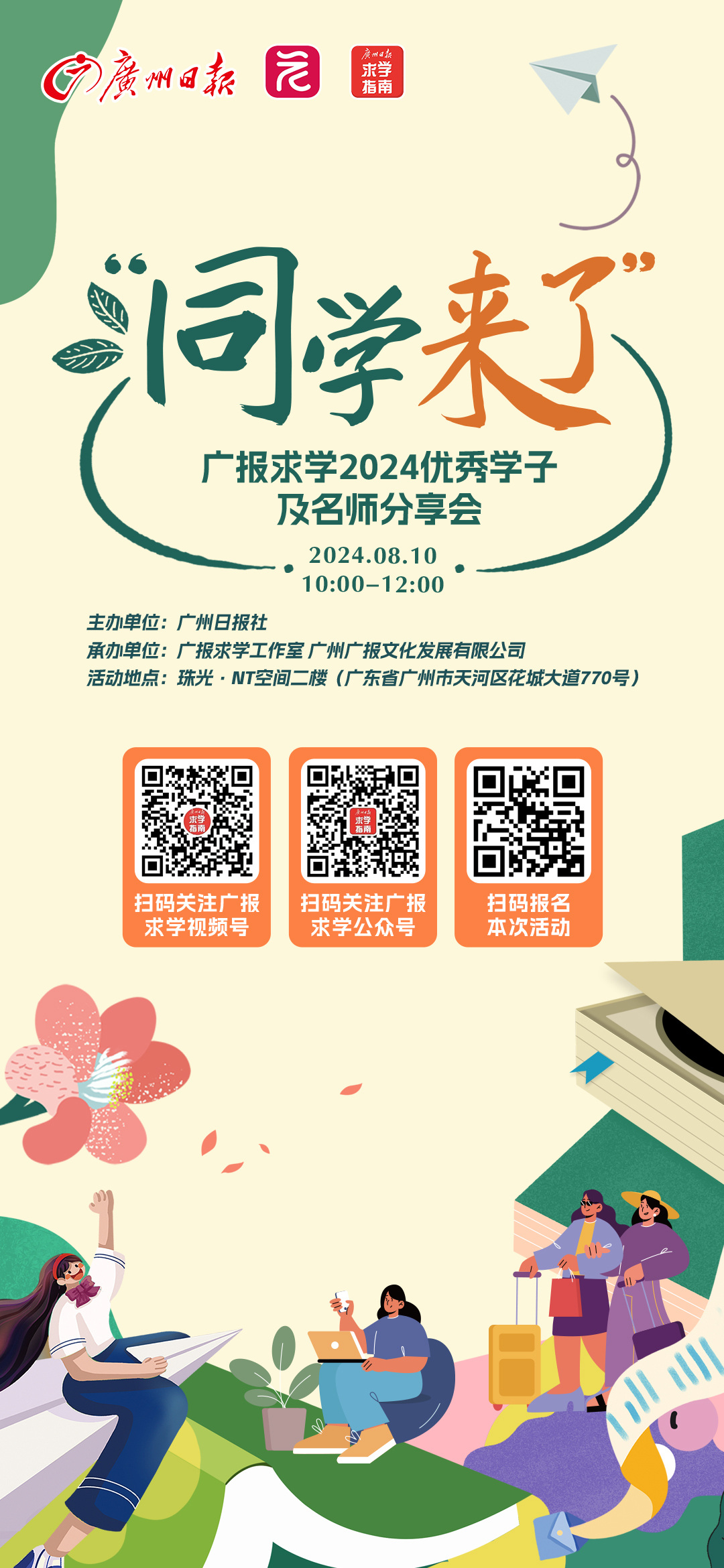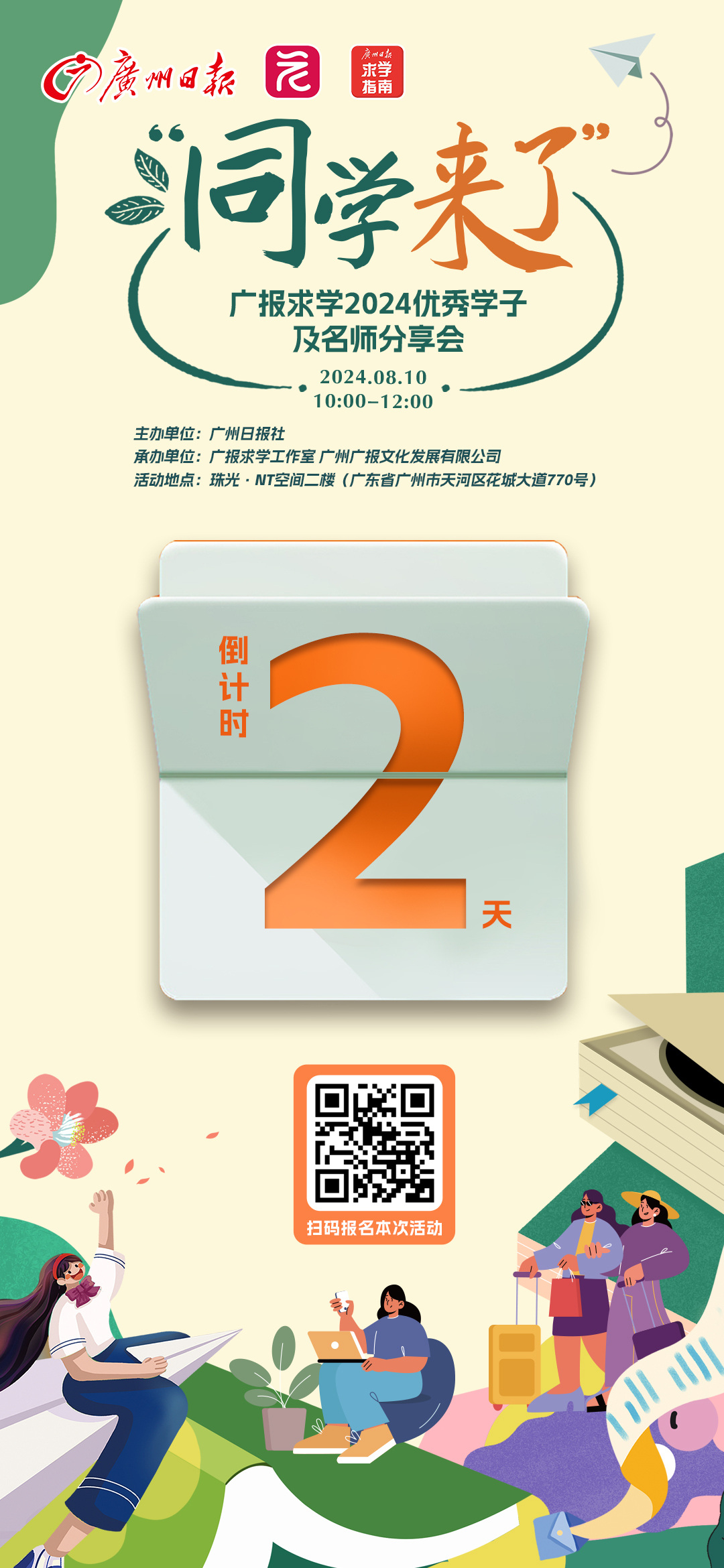 还有2天,8月10日(周六)9:30-12:00,“同学来了”广报求学2024优秀学子及名师分享会即将在广州举行。活动上,两位神秘嘉宾也将与大家见面,他们就是两位即将入读北京大学和清华大学的同学。
