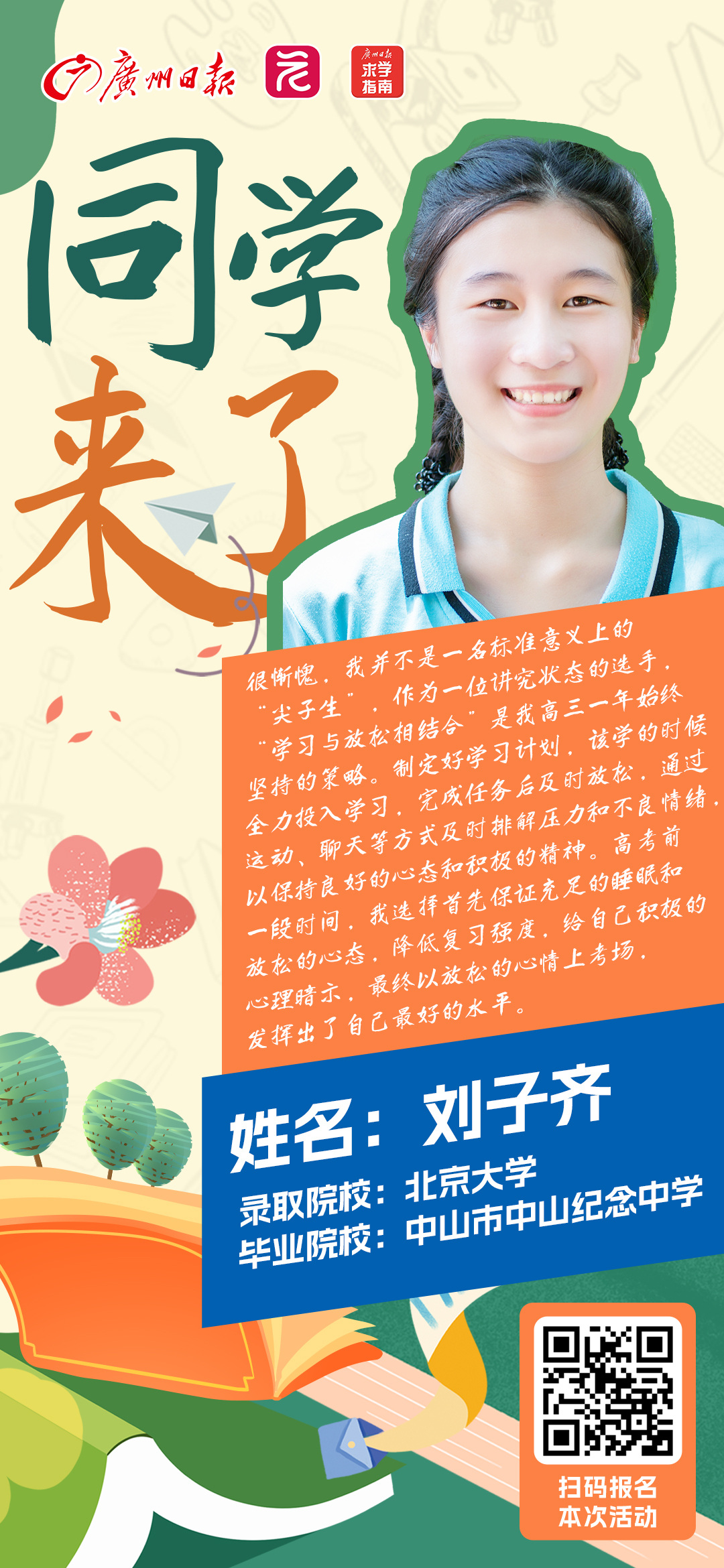 “同学来了”是由广报求学打造的精品升学交流平台。每年暑假,广报求学均邀请当年新晋大一学子,和广大学生、家长面对面畅聊升学路径,共话成长之道。2021年,广报求学推出“同学来了”第一季分享会活动,赢得读者的热烈反馈。2023年暑假,又推出了“同学来了”第二季,既聚焦优秀学子的榜样力量,也关注广大学生、家长的痛点和需求。