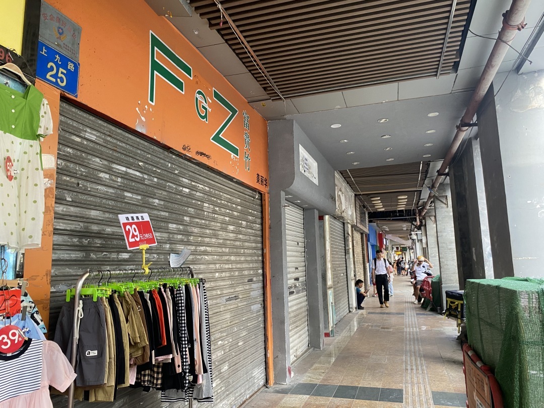 然而,站在上九路、下九路的交接处、德星路路口,会明显感觉动与静的反差。在上下九路,每走十几米,会在街面看到连续几个铺面关停,空置率目测在五成以上。一些门前贴有招租小广告,有一些则没有贴,颇为冷清。开门的则多为鞋服、日用等店铺,不少是鞋服批发档口以及物流仓库,有店员在做当天最后的货品打包、清点。