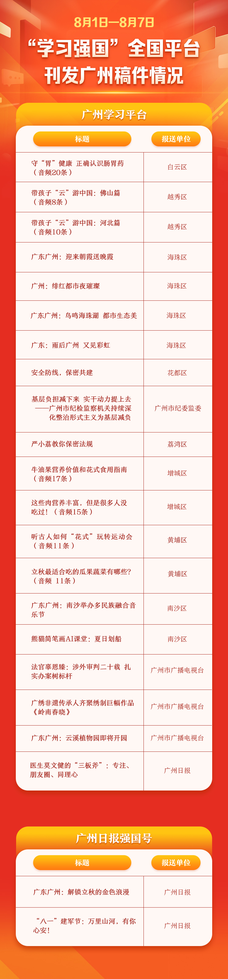 8月1日—8月7日,“学习强国”广州学习平台共有105个稿件(含音频集)、广州日报强国号有2个稿件被全国平台选用。