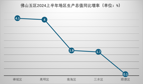 从增速上看,禅城、高明“跑”在五区最前。据梳理,今年上半年,禅城区地区生产总值同比增长4.1%,高明也达到了4%,这一数值同时跑赢了广东、佛山的“大盘”(广东2024上半年GDP同比增长3.9%;佛山2024上半年同比增长1.7%),表现抢眼。南海、三水、顺德三个区的增速则分别位居三、四、五名,其中经济体量最大的顺德区接近“0增长”,上半年GDP增速仅达0.1%。