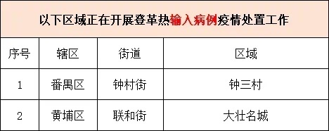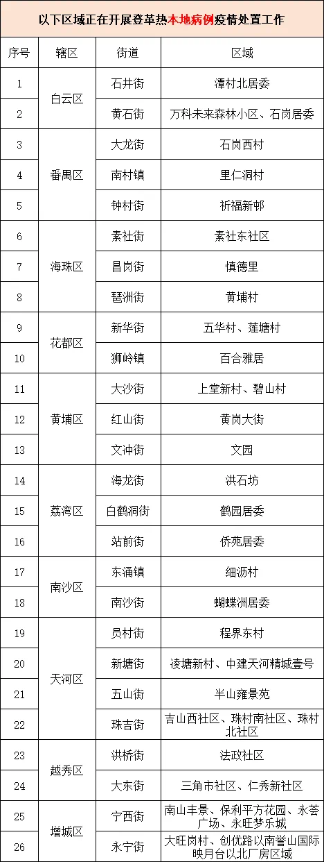 当前已进入登革热流行季节,5月以来广州市已陆续报告多例本地和输入登革热病例。广州市疾病预防控制中心今天发布提醒,截至8月8日,以下区域正在开展登革热疫情处置,存在传播风险,请市民注意防范。