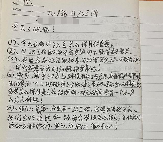 倪卓君当时在接受实习培训时,需要定期记下自己的学习内容,记录的内容十分详尽,已经细化到了具体场景的具体步骤。那段时间,是倪卓君成长最快、变化最大的一段时间。而在这篇日记的最后一段,掌握新技能、认识新朋友的喜悦之情已经溢于言表。