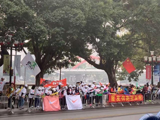 虽然星友伴跑团得到多方不同程度的支持,但还是会为交通、餐食、补给和参赛费用发愁,有时筹措资源也比较费力。协会组织、大家一起跑,跑团里也需要家长和志愿者协同努力。图为2020年广州马拉松,心友会为倪卓君等人打气加油。
