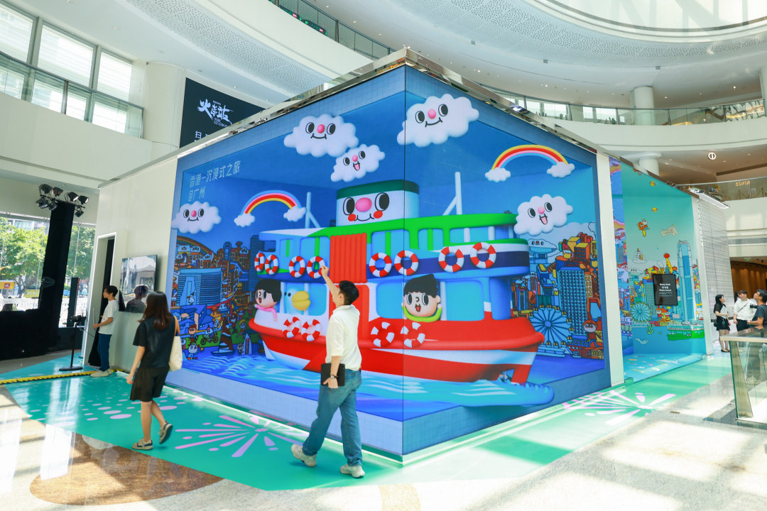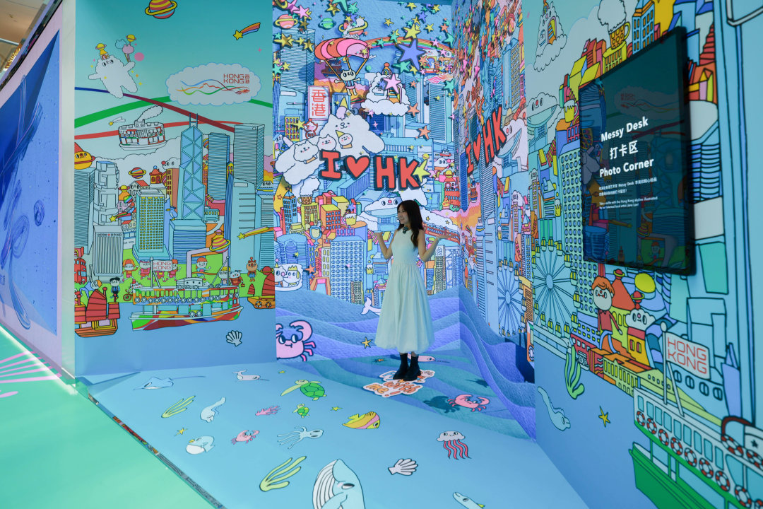 展览的一大亮点是外部展墙屏幕运用了裸眼3D技术,观众站在标注的“最佳观看点”,便可感受到面前屏幕画面的立体视觉效果,屏幕展示了艺术家为展览几大主题设计的不同动画。外部还设置了打卡区,由香港艺术家设计了众多香港特色元素的插画。打卡区还有隐藏的互动操作等你来尝试体验!