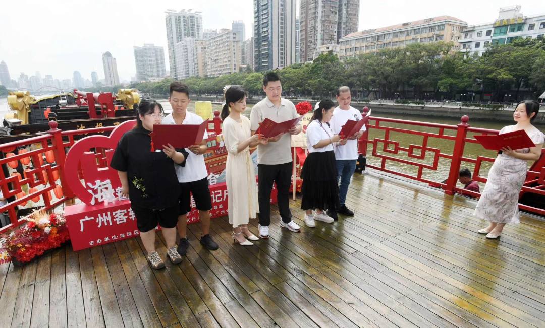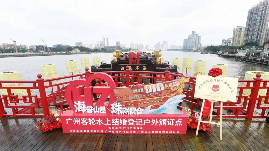 8月10日,正值传统七夕佳节,广州客轮水上结婚登记户外颁证点位于太古仓码头“南海神”游船上,成功举办了一场七夕浪漫颁证活动,为新人们提供了一个在珠江“见证”下宣誓的独特颁证场景,更有“百年修得同船渡”的美好寓意和祝福。据介绍,水上颁证点是为积极响应海珠区婚庆服务产业高质量发展号召,海珠区民政局携手广东省婚庆行业协会及广州客轮管理方设立的首个水上颁证点。
