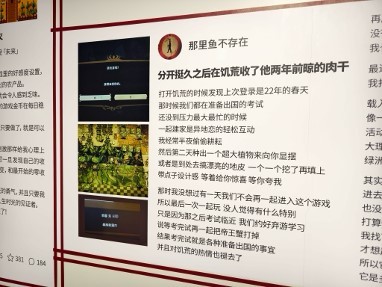 一走进展厅,一股时代的气息便扑面而来。墙上挂满了玩家在游戏中的难忘瞬间的截图,它们不仅记录了游戏的数据,更记录了发生在那些瞬间的故事,是玩家们在游戏中寻找刺激和快乐的历史见证。笔记背后是与游戏相关的生活与心事。