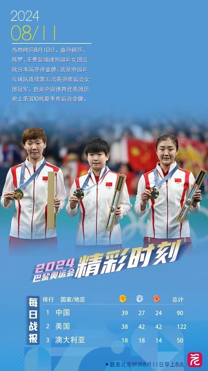 奥运时刻 | 国乒女团斩获中国夏奥第300金;明天凌晨3点巴黎奥运闭幕