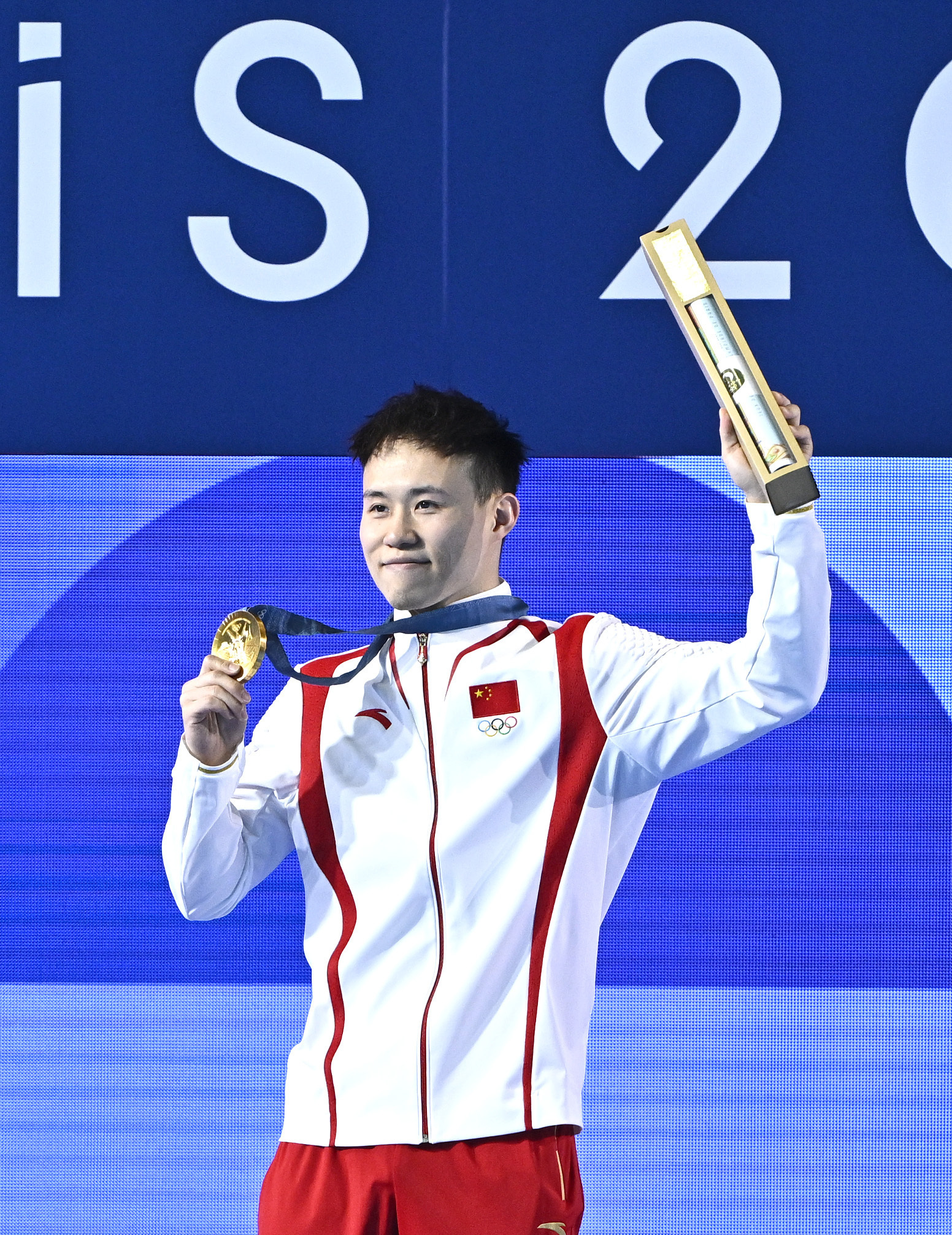 8月8日,谢思埸在颁奖仪式上。当日,在巴黎奥运会跳水项目男子3米板决赛中,中国选手谢思埸获得金牌。新华社发