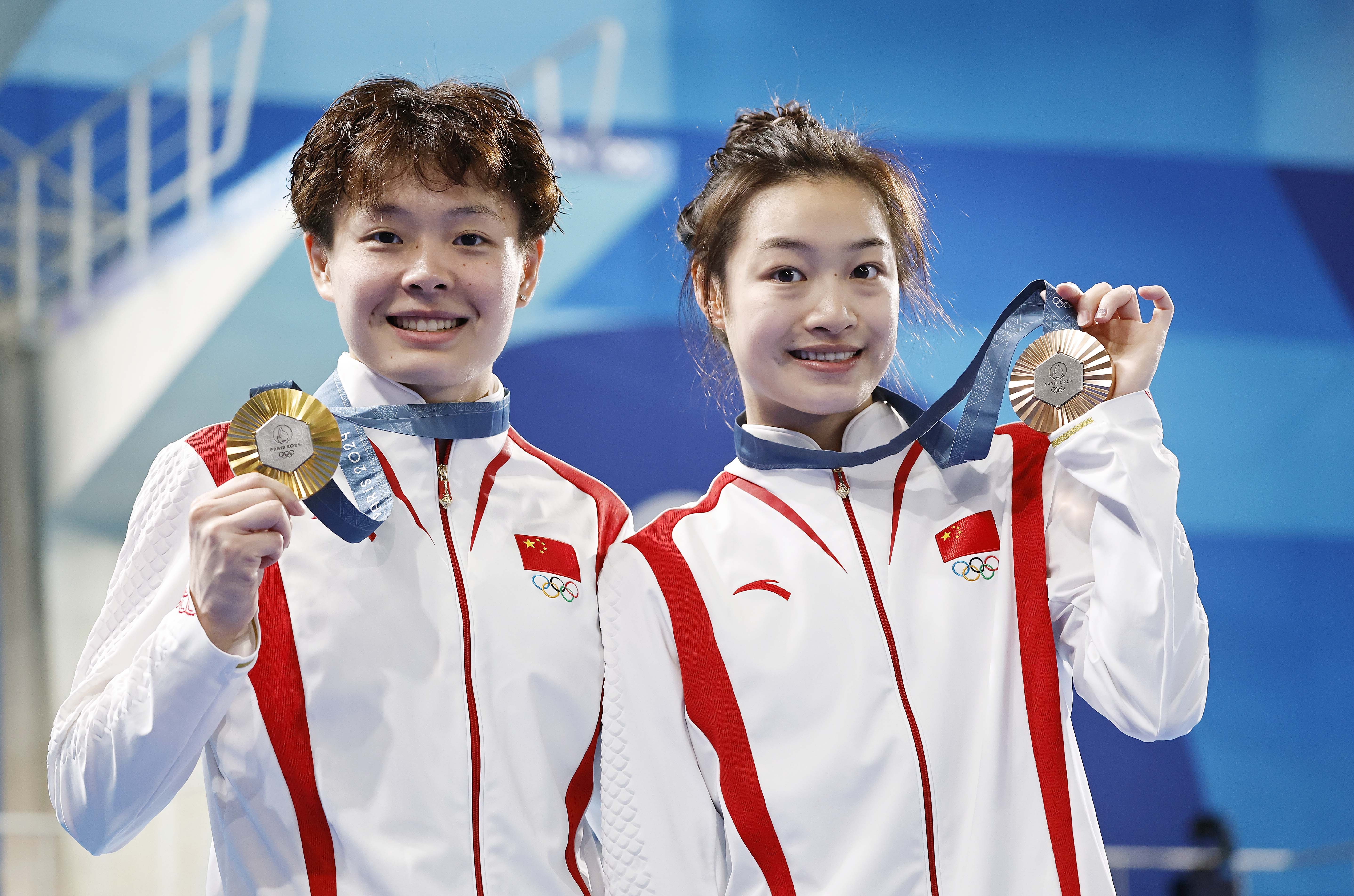 8月9日,冠军中国选手陈艺文(左)、季军中国选手昌雅妮在颁奖仪式后。当日,在巴黎奥运会跳水项目女子3米板决赛中,中国选手陈艺文获得金牌。新华社发