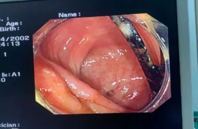 随后,医生安排患者进行肠镜检查,发现其回盲部有长条状塑料异物嵌顿较紧,而且塑料异物的一端已刺入患者的肠壁内,产生局部炎性及隆起。肠镜提示,其回盲部异物嵌顿,医生当即对患者隆起处病变在内镜下进行活检,活检病理提示为“回盲部慢性炎性病变”。