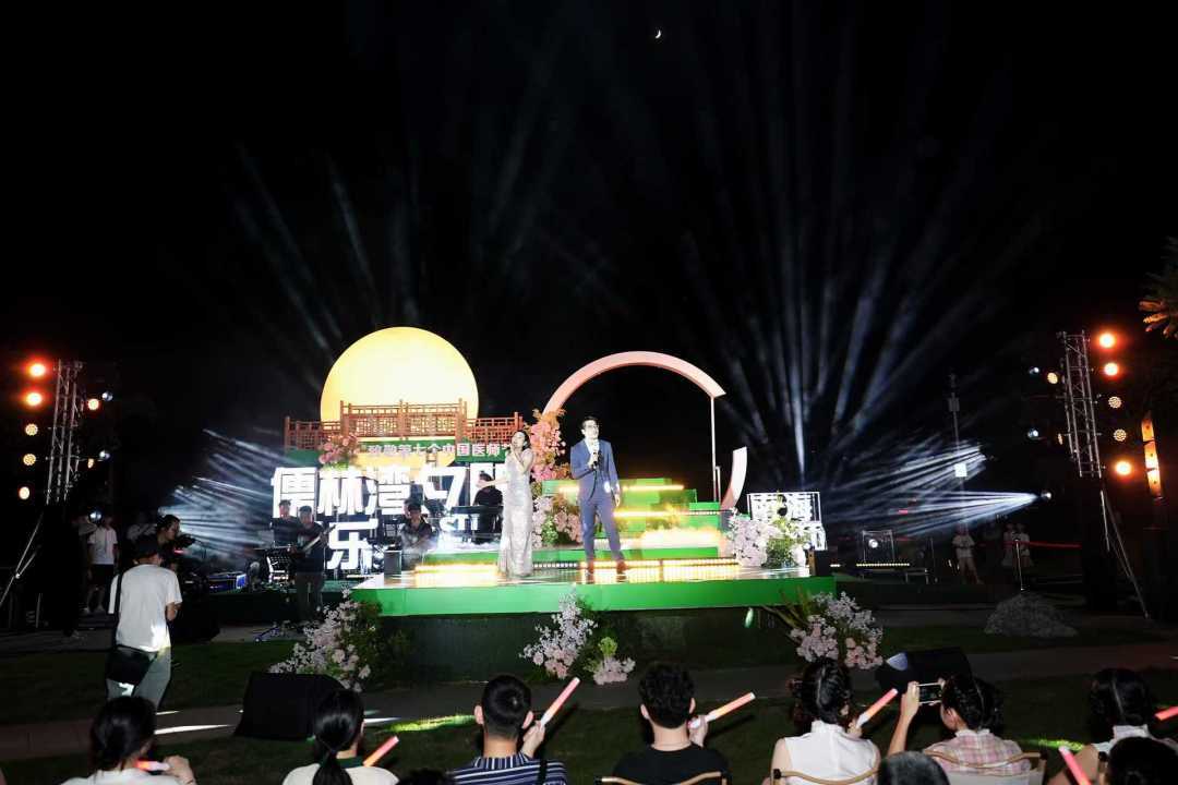 摊位中央的儒林湾夕阳音乐会舞台同样精彩。本次儒林湾夕阳音乐会是致敬“中国医师节”专场,来自南海区卫生健康系统、广东一方制药有限公司的17位歌手登台献唱。今年“中国医师节”的主题是“崇尚人文精神 彰显医者仁心”,工作时他们是爱岗敬业的医护人员,精湛医术守护健康,无私大爱温暖人心;在舞台上他们是气场全开的实力唱将,耳熟能详的歌曲、无可挑剔的唱功、情绪饱满的感染力现场观众被当场“圈粉”,在舞台下热情跟唱“打call”。歌手们献唱中医药主题歌曲庆祝南海首个中医药夜市的成功举办;演唱《但愿人长久》等情歌在七夕节为现场情侣送上长长久久的祝福;最后,还向南海区全体医务工作者献上卫健主题的原创歌曲《医家人医家亲》和改编歌曲《医路相伴》,感谢他们为健康南海做出的贡献。卫健歌手和专业乐队完美配合,与观众合唱互动,多次将现场气氛推向高潮!