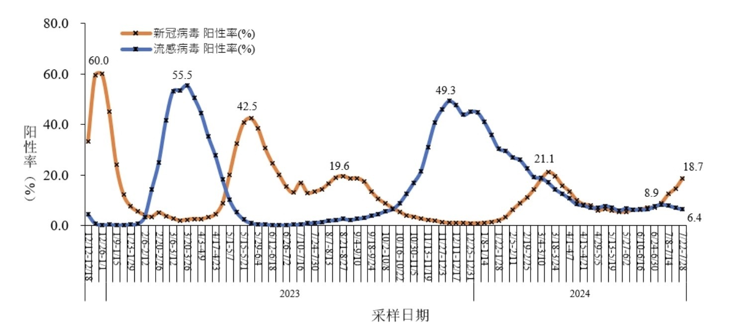 全国哨点医院流感样病例新冠和流感病毒阳性率变化趋势。(来源:中疾控官网)