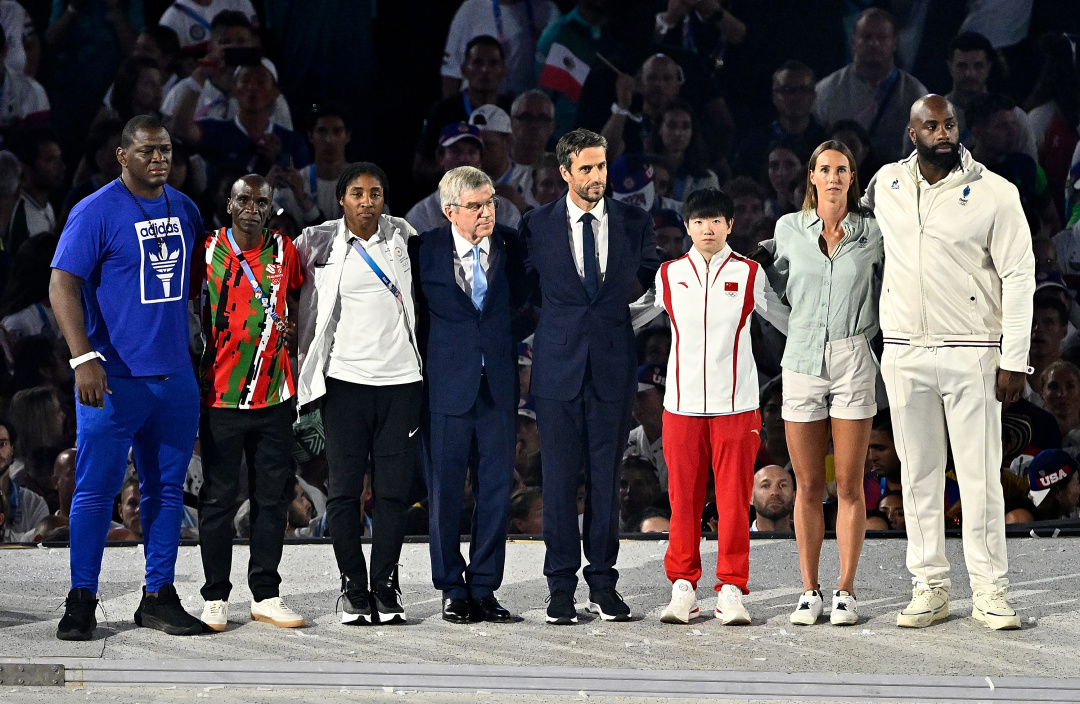 8月11日,国际奥委会主席巴赫(左四)和巴黎奥组委主席托尼·埃斯坦盖(右四)与运动员代表一起在闭幕式上。来源:新华社
