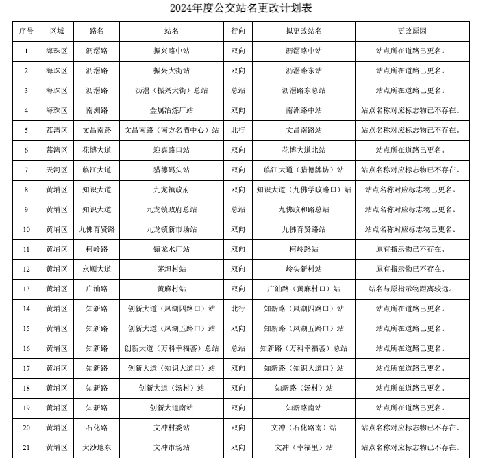 12日,广州市交通运输局发布关于征求2024年度公交站点站名更改意见的通告。