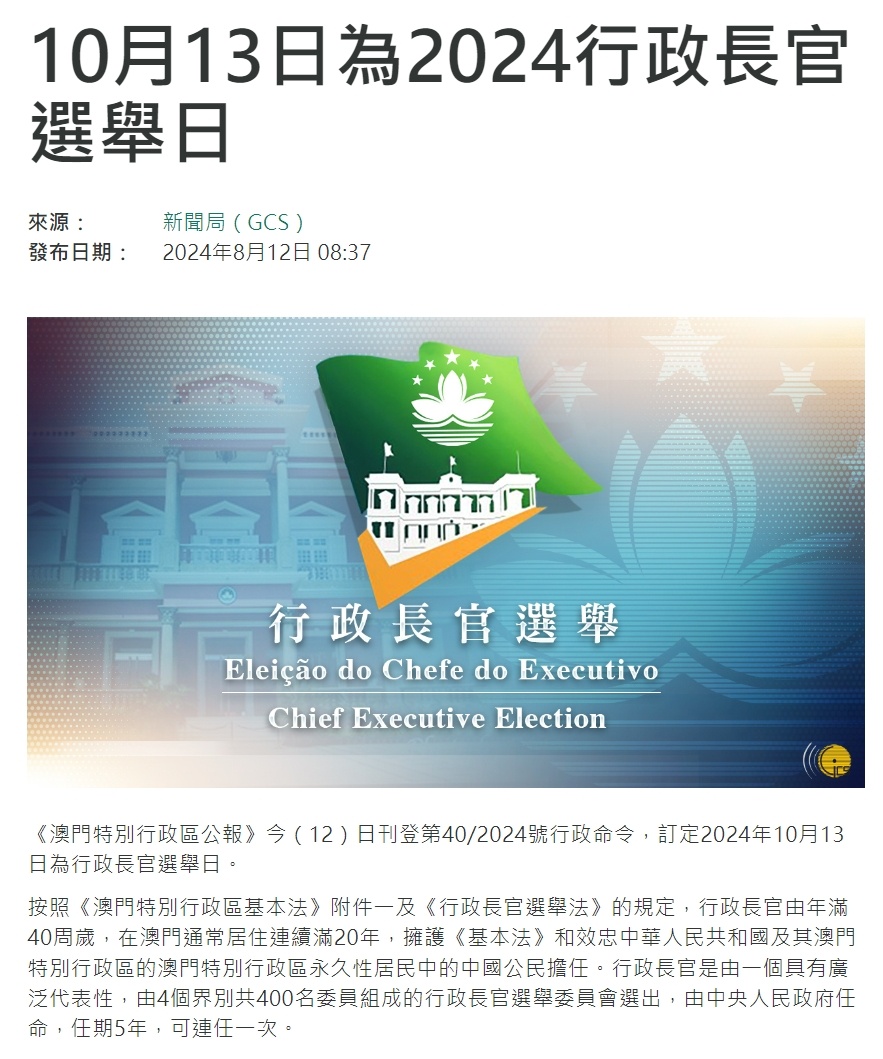 8月12日,《澳門特別行政區公報》刊登第40/2024號行政命令,訂定2024年10月13日為澳門特區行政長官選舉日。