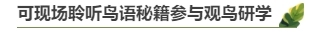 值得一提的是,现场还有机会聆听“鸟语蛙鸣”,参与观鸟研学。观鸟专家郭世军老师将带领到场的学生进行一场主题为“鸟语秘籍”的研学讲座以及户外活动,在寻觅和聆听鸟语、蛙鸣的过程中,通过声音的角度,去让孩子感受身边的美,体会未见过的自然之美。