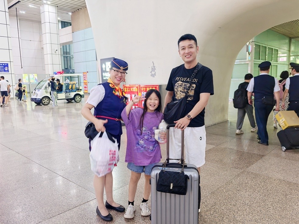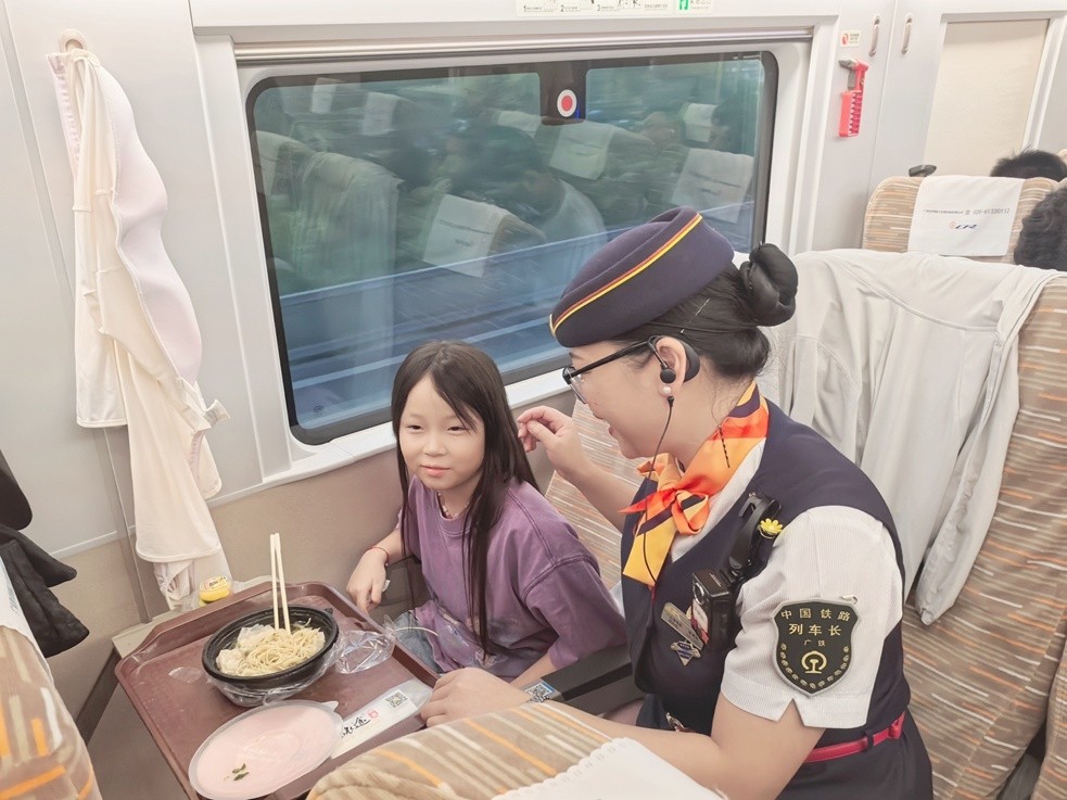 随即,曾琳纵拨通了女孩爸爸的电话,当听到孩子一个人在车上时,孩子父亲很着急。曾琳纵安慰道:“孩子在高铁上我们会照看好,不用担心,只需要到车站来接她就行。”女孩爸爸连连感谢。