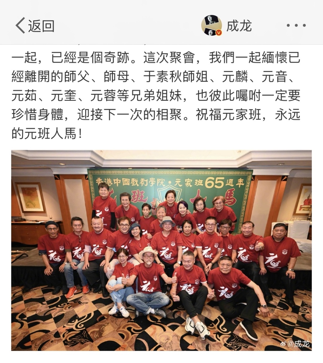 8月12日,著名演員成龍發文紀念元家班成立65週年,並曬出和同門們的大合照。