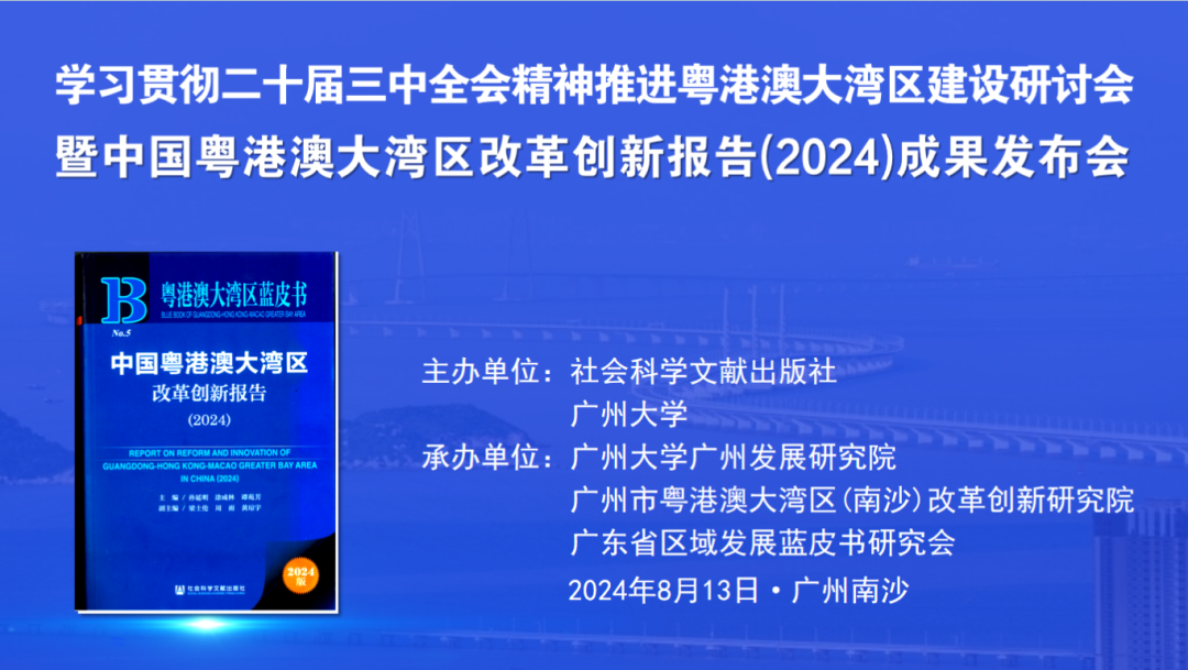 8月13日,由社会科学文献出版社与广州大学主办、广州市粤港澳大湾区(南沙)改革发展研究院等单位承办的学习贯彻党的二十届三中全会精神推进粤港澳大湾区建设研讨会暨《粤港澳大湾区蓝皮书:中国粤港澳大湾区改革创新报告(2024)》(下称《蓝皮书》)成果发布会在广州南沙举行。